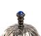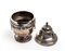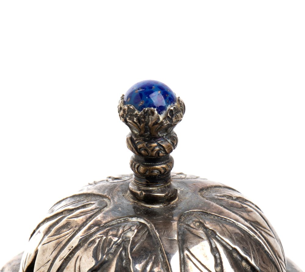 interamente sbalzato, cesellato e traforato, base circolare a decoro fogliato, corpo cilindrico delimitato superiormente da una fascia decorata a dobloni alternati a rosette e decorato con foglie d'acqua nella parte inferiore. Coperchio gradinato con festoni di ghirlande e cimatura con pasta vitrea.