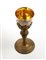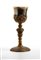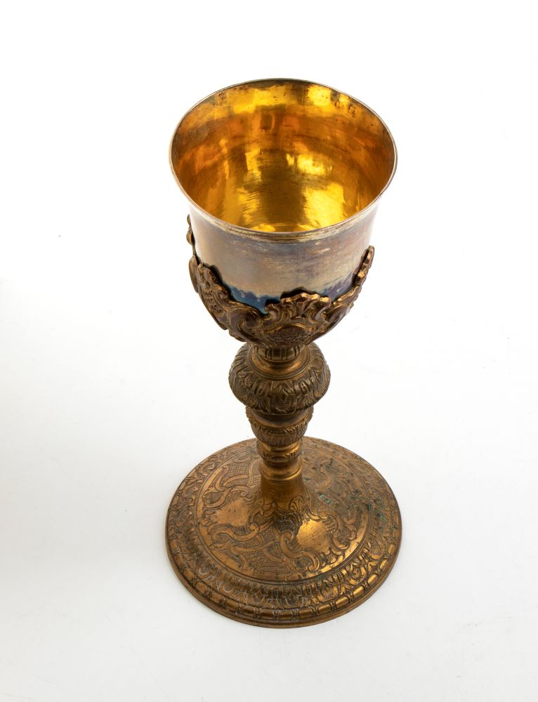 base circolare dorata incisa con motivi floreali e scudi; fusto centrale liscio con nodo a motivi vegetali e figure geometriche; coppa liscia in argento dorato.