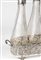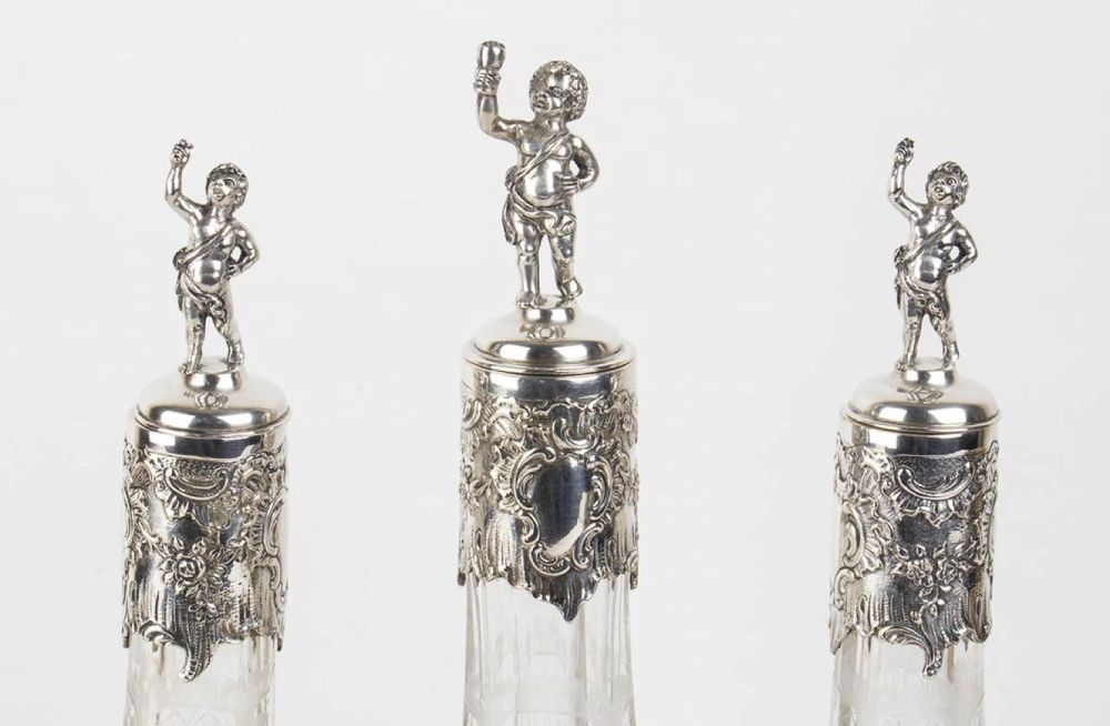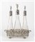 decanter tripartito, composto da tre bottiglie uguali in vetro inciso, su basamento in argento traforato e decorato con motivi rocaille poggiante su quattro piedini fogliati.