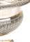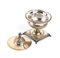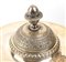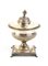 su alto piede quadrangolare. Il corpo della coppa e il coperchio presentano una ricca decorazione a cesellatura minuta con motivi a griglia e fasce lisce. La base è ornata con bordi a rilievo e sorretta da quattro piedini a zampa ferina. Il coperchio a innesto è sormontato da un pinnacolo a pigna.