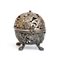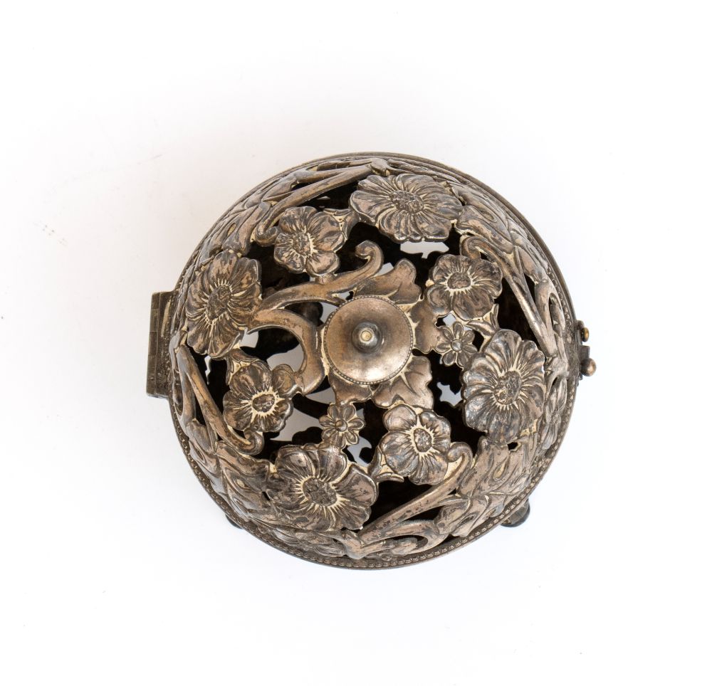 di forma sferica, poggiante su quattro piedini sagomati e dotato di chiusura incernierata. L’intera superficie è traforata e cesellata con ricchi motivi fogliati e floreali.