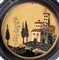 L'altro pannello presenta una scena collinare più focalizzata sull’architettura: un complesso di case e torri dai tetti rossi si erge su un pendio reso con pietre dalle venature naturali, mentre due cipressi slanciati definiscono il paesaggio tipicamente toscano. La vegetazione sullo sfondo, trattata con delicatezza, contribuisce a creare profondità e armonia nella composizione.