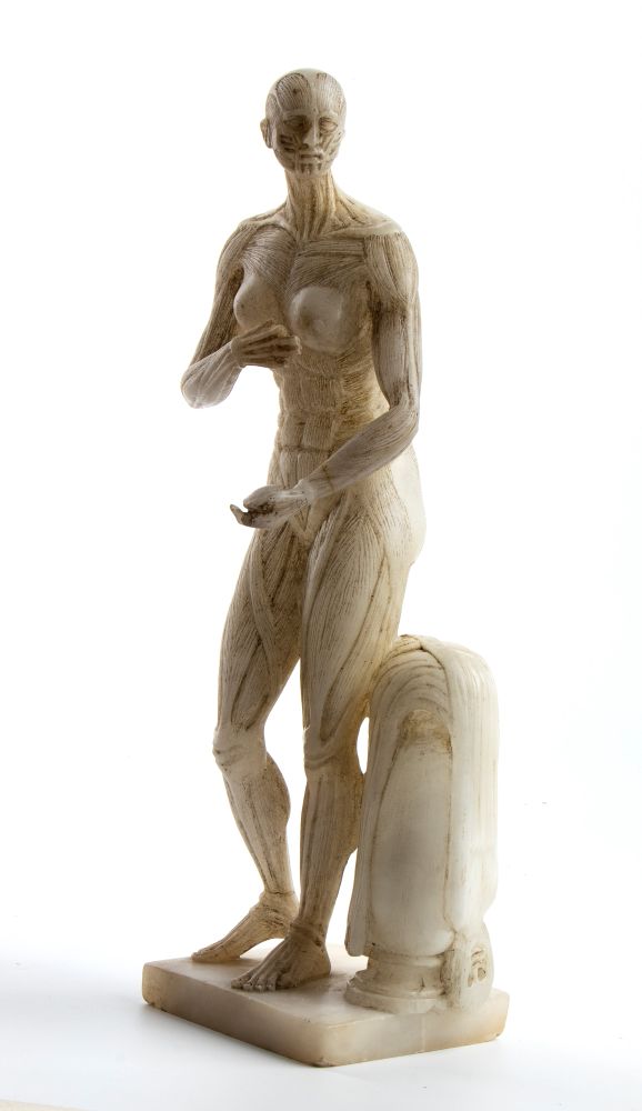 raffigurante figura maschile stante in contrapposto, con buona resa della muscolatura superficiale. Il braccio destro è piegato sul petto, mentre la mano sinistra regge una sfera. La figura poggia su una base quadrata. L’opera, di gusto accademico, è riconducibile alla tradizione degli scorticati didattici per studi artistici.