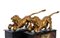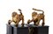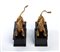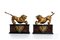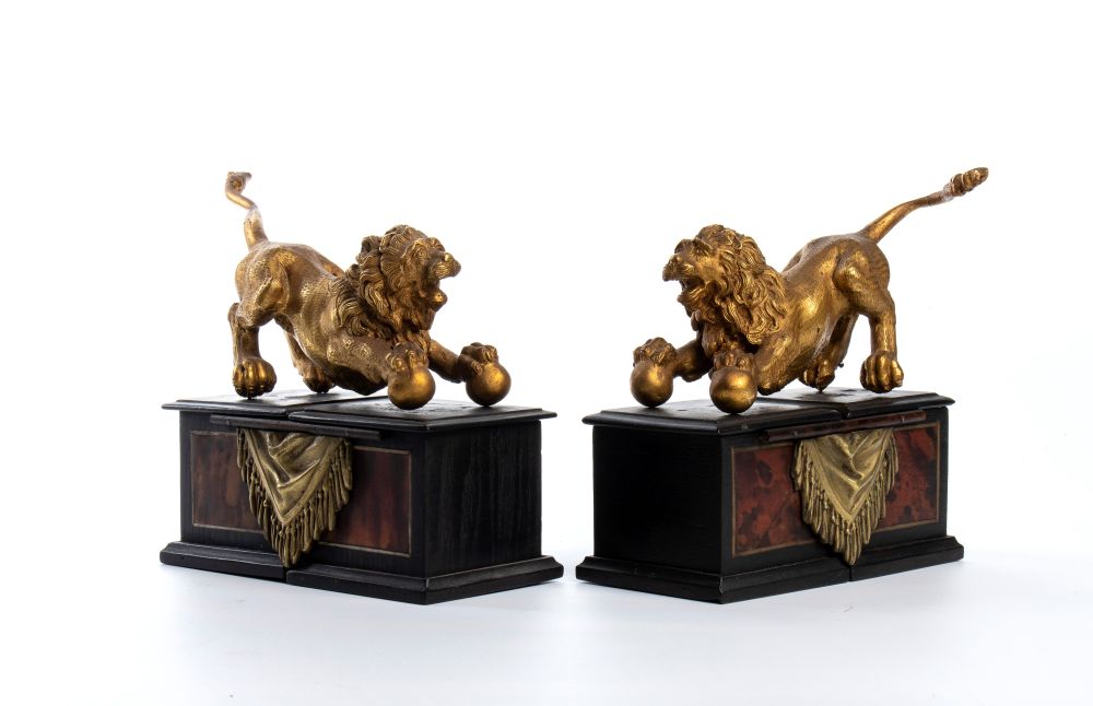 fusi in bronzo e finemente dorati, raffigurati in posa dinamica: accovacciati sul lato anteriore, con la bocca aperta, mentre le zampe poggiano sue delle sfere, simbolo di dominio e forza vigilante. I leoni poggiano su eleganti piedistalli rettangolari ignei, con rivestimenti in legno ebanizzato e pannelli in finta tartaruga, secondo una tipologia decorativa che richiama i mobili di lusso e gli oggetti da studiolo o galleria d’arte.