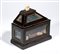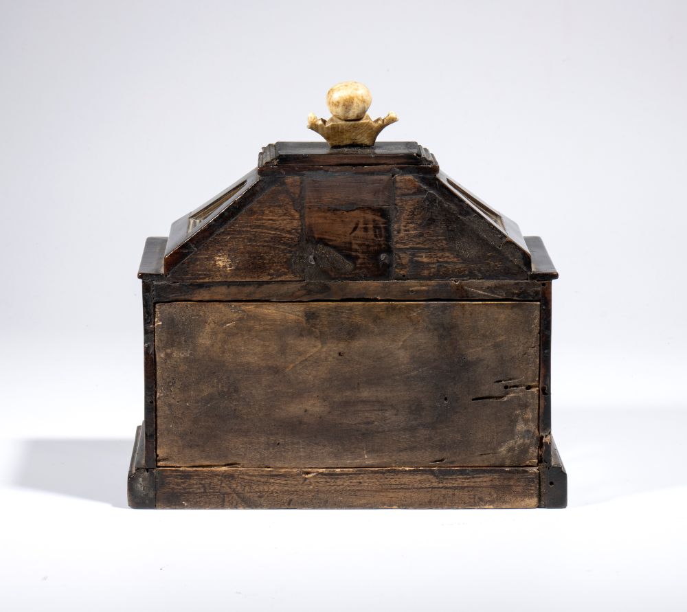 a forma di tempietto, realizzata in legno con struttura parallelepipeda e tetto spiovente. La cassa presenta un'ampia sezione frontale vetrata che funge da ostensorio, mostrando al suo interno un diorama reliquiario con la figura di un piccolo scheletro. La sommità piramidale è decorata internamente con un tessuto verde con motivi e culmina con un coronamento raffigurate un teschio con tibie incrociate.