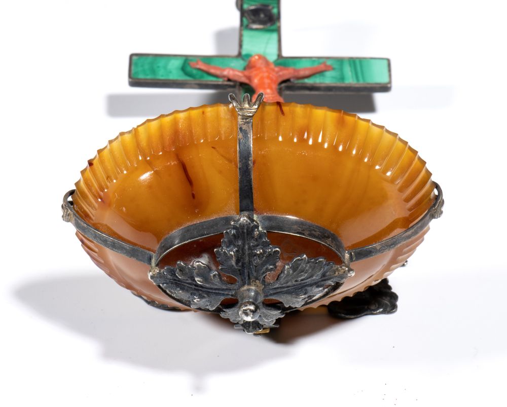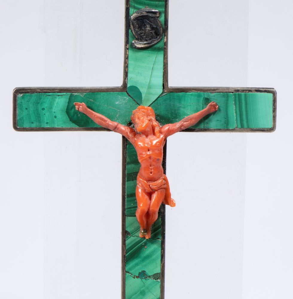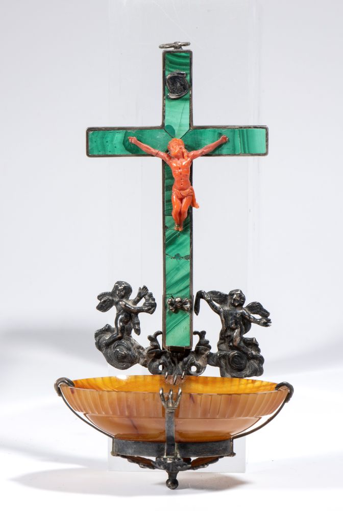 composta da una Croce in malachite sulla quale è applicato un piccolo Crocifisso Corpus Christi in corallo scolpito. Il bacino per l'acqua santa è costituito da una coppa semicircolare realizzata in agata. La croce e la coppa sono unite da elementi in metallo, che includono due putti alati in posizione simmetrica. Sulla sommità della croce è presente un anello per la sospensione.