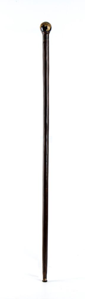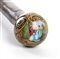 da passeggio con pomello in stile porcellana di Sèvres, decorato a mano, presenta una scena romantica: un uomo e una donna in abiti aristocratici immersi in un idilliaco paesaggio bucolico. Il pomello ha un fondo scuro e la scena è realizzata con colori pastello, incorniciata da un motivo decorativo color oro.