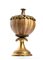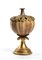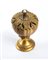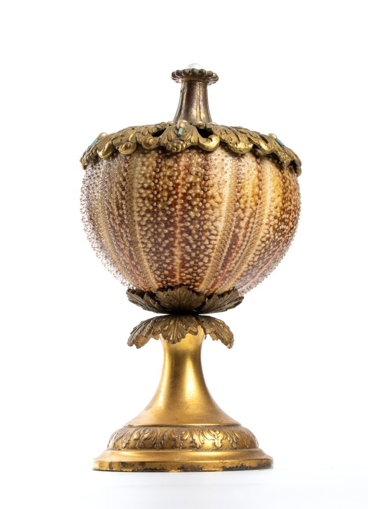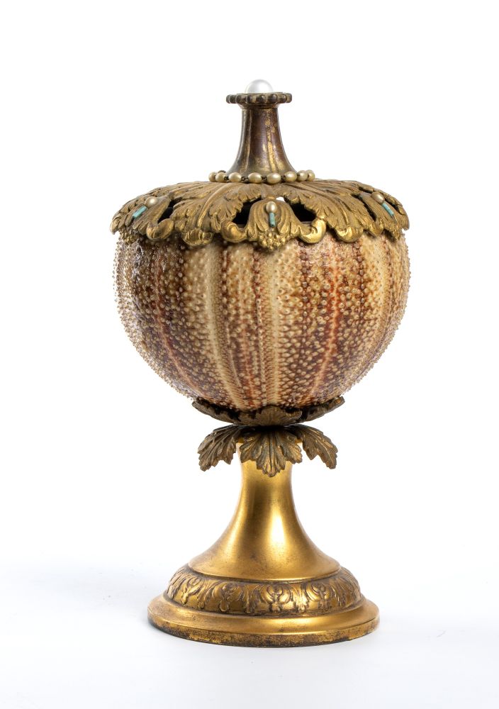 Echinus Esculentus, montato su base circolare in ottone, decorata con una fascia a motivi fogliati. La struttura si eleva con due linee di foglie intagliate che avvolgono e sostengono il riccio, fungendo contemporaneamente da decoro e da castone. La parte interna è interamente in ottone e presenta un coperchio ad innesto, finemente lavorato con motivi fogliati, che prosegue il linguaggio decorativo della base. I bordi del coperchio sono arricchiti da piccole perle naturali e piccoli cilindri in pasta di turchese, mentre un delicato filo di perline imperniate circonda il manico di forma allungata, sormontato da una perla sintetica cabochon. Oggetto destinato a collezioni e cabinets of curiosities.