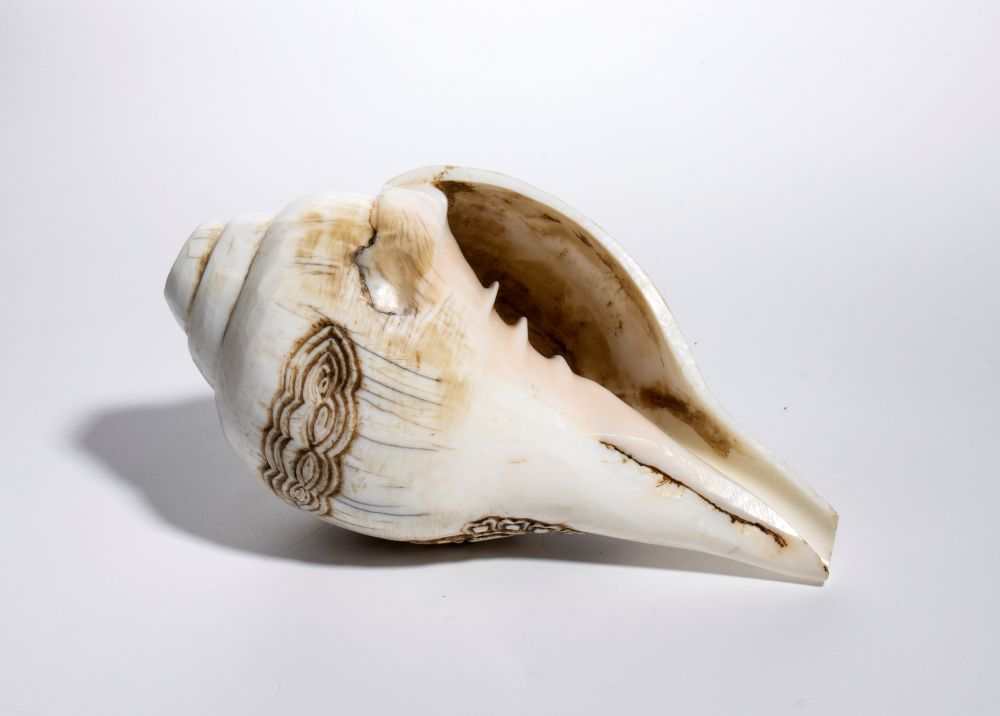 raffigura uno degli Otto Simboli di Buon Auspicio del Buddhismo tibetano e un antico oggetto rituale di origine indiana. Realizzata generalmente in conchiglia bianca della specie Turbinella pyrum (comunemente chiamata Xancus), dalla forma caratteristica a spirale. Rappresenta il profondo e vittorioso suono che diffonde l’insegnamento del Dharma, raggiungendo ogni essere e risvegliandolo dall’ignoranza e dalla sofferenza, permettendo di conseguire la liberazione. Il termine Sankha associato a questo oggetto è simbolicamente associato a Vishnù nella tradizione induista. La conchiglia presenta un foro sulla punta, realizzato per usarlo come tromba o strumento a fiato. Sul corpo della conchiglia è spesso raffigurato Vishnù in piedi, che domina simbolicamente un uomo steso a terra, esprimendo la supremazia divina e il trionfo del sacro sul profano. Questo dettaglio iconografico rafforza il significato della Sankha come strumento di diffusione del Dharma, risvegliando gli esseri dall’ignoranza e dalla sofferenza e conducendoli verso la liberazione.