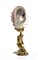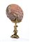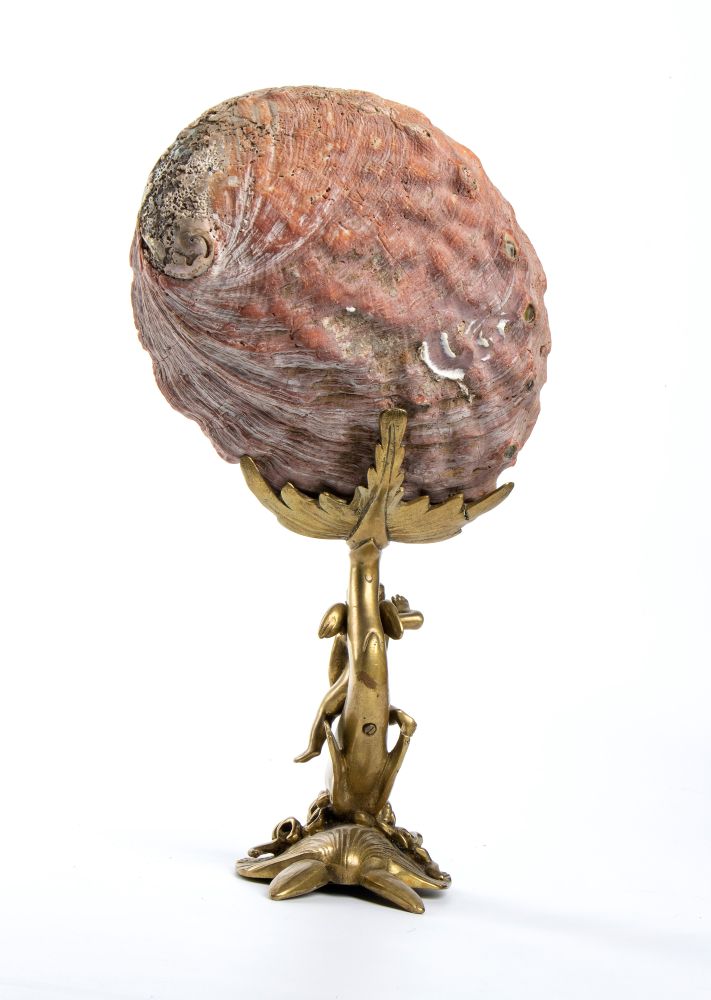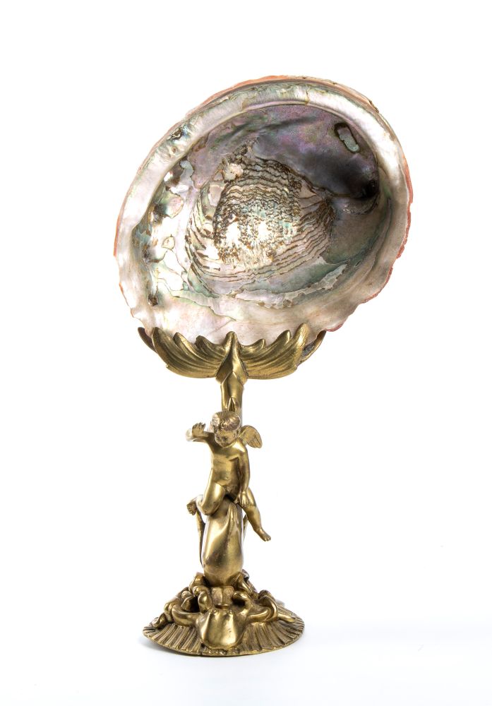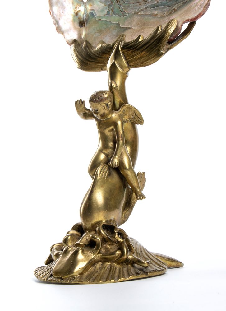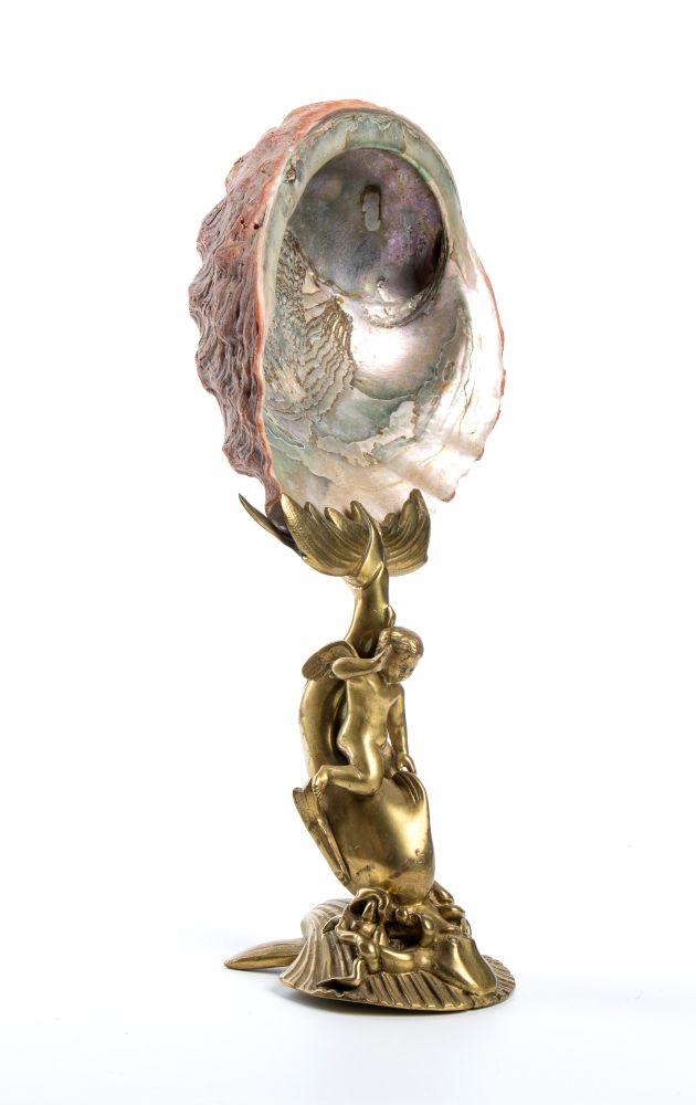 Haliotis Midae, proveniente dal Sudafrica, montata su base in ottone. Alla base c'è una conchiglia ove si erge un polpo finemente modellato, al cui sommo è collocato un delfino, cavalcato da un putto alato. La coda del delfino, elegantemente arcuata, funge da supporto per la conchiglia, integrando armoniosamente gli elementi figurativi e naturali. L’insieme combina la bellezza naturale della conchiglia con la ricchezza scultorea del metallo, creando un effetto dinamico e decorativo tipico della tradizione ornamentale europea. Esemplare rappresentativo di oggetti da collezione e cabinets of curiosities.