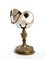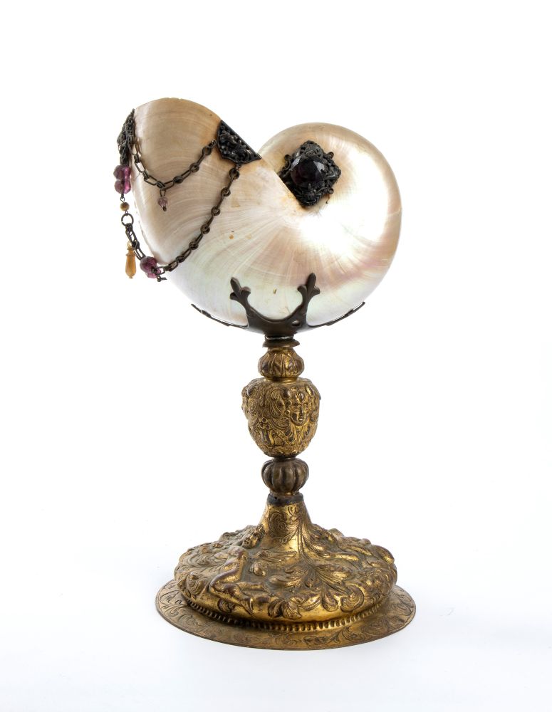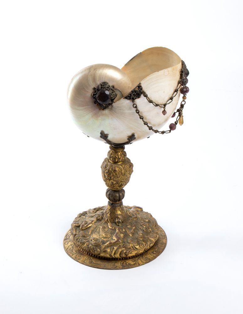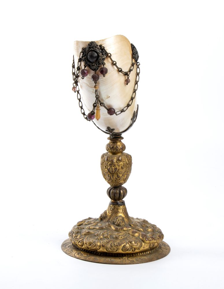 montata su base circolare bombata in rame dorato, riccamente decorata a sbalzo e cesello con figure di putti, volute e motivi fogliati. la conchiglia p incastonata in elementi che avvolgono la sua forma e ulteriormente ornata con elementi a catene e paste vitree imperniate e altre incastonate. Produzione tipica della produzione per collezioni e cabinets of curiosities.