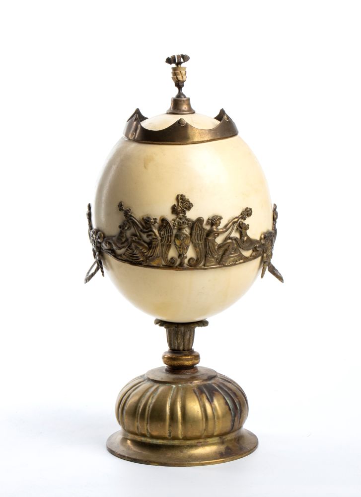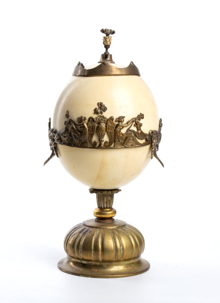 di forma rotonda, bombata e scanalata. L’uovo è ornato da una fascia decorativa in metallo applicata lungo la parte centrale, raffigurante una teoria di figure femminili alate e danzanti in stile classico, probabilmente ispirate a soggetti mitologici o allegorici. La parte superiore è chiusa da una montatura a corona, anch’essa in ottone, sormontata da un piccolo pomello. Questo tipo di manufatto appartiene alla tradizione ottocentesca degli oggetti d’arte e curiosità esotiche, derivata dalle “Wunderkammern” rinascimentali e barocche.