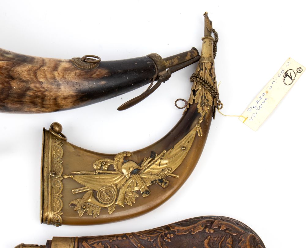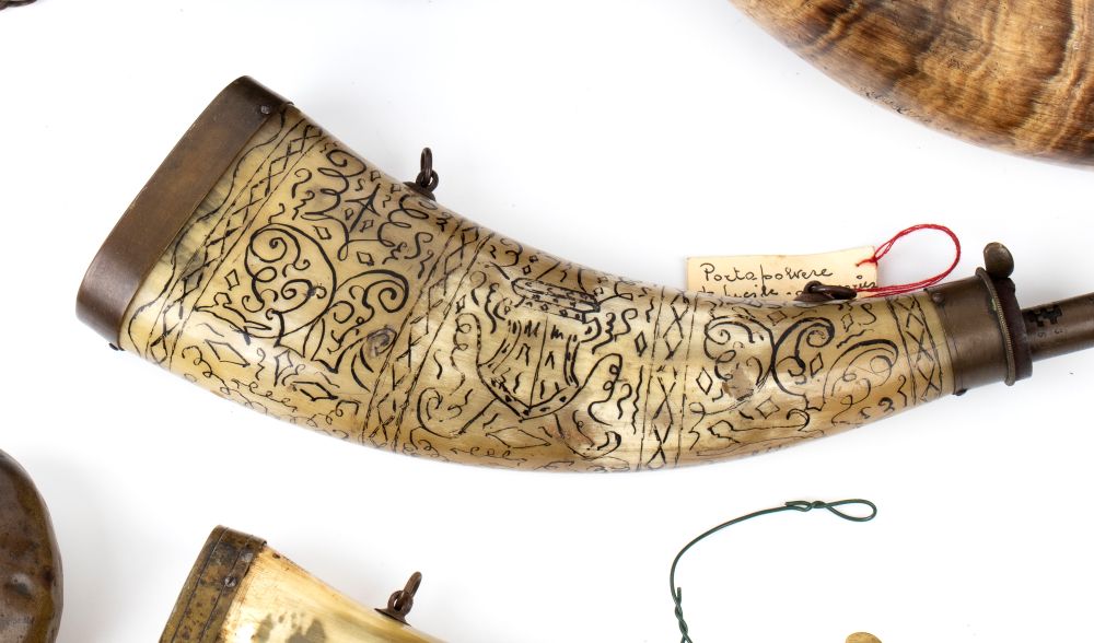 11 - portapolvere inglese o americano per fucile da caccia, metà XVIII secolo.
