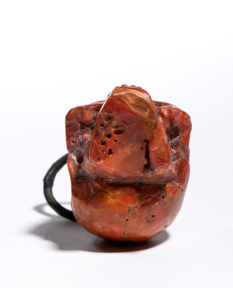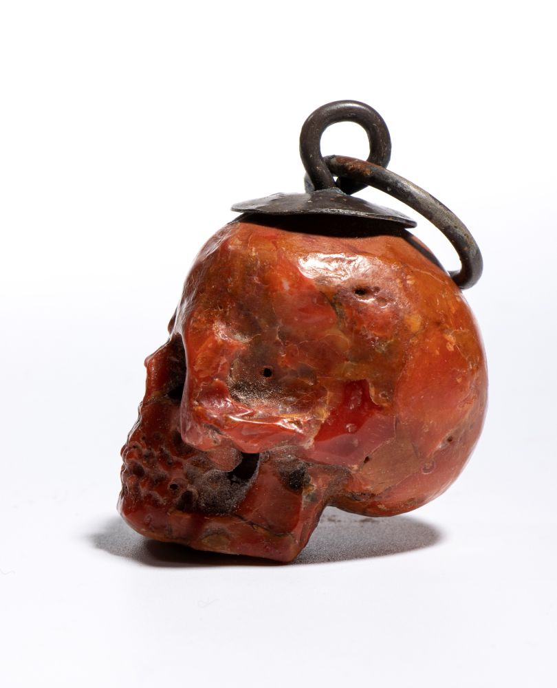 La scultura è accurata e presenta un buon livello di dettaglio. Sulla sommità del teschio è applicato un gancio da cui parte un anello dello stesso materiale, pensato per permettere l’uso come pendente o amuleto. È anche possibile interpretare questo pendente come un memento mori, cioè un oggetto simbolico che invita alla consapevolezza della mortalità umana. I memento mori erano diffusi già nel Medioevo e nel Rinascimento e venivano utilizzati per ricordare la caducità della vita, spronando a vivere con saggezza, virtù o spiritualità. Il simbolo del teschio era tra i più comuni: rappresentava la transitorietà dell’esistenza e il valore del tempo. Anche oggi, in contesti artistici o personali, un teschio indossato come gioiello può mantenere questo significato meditativo, oltre a quello estetico.