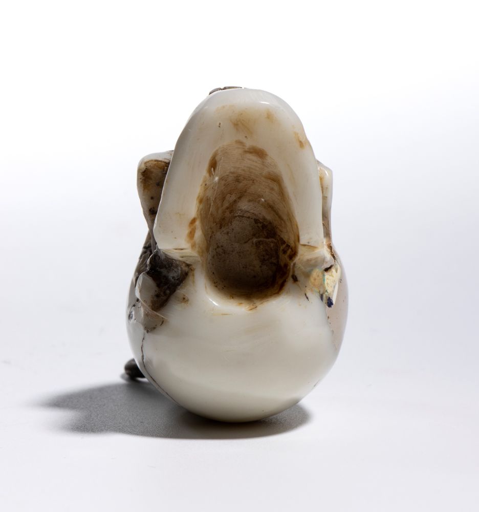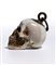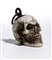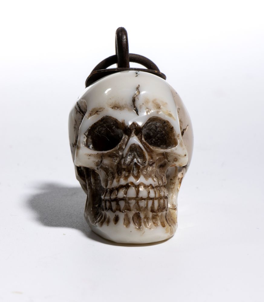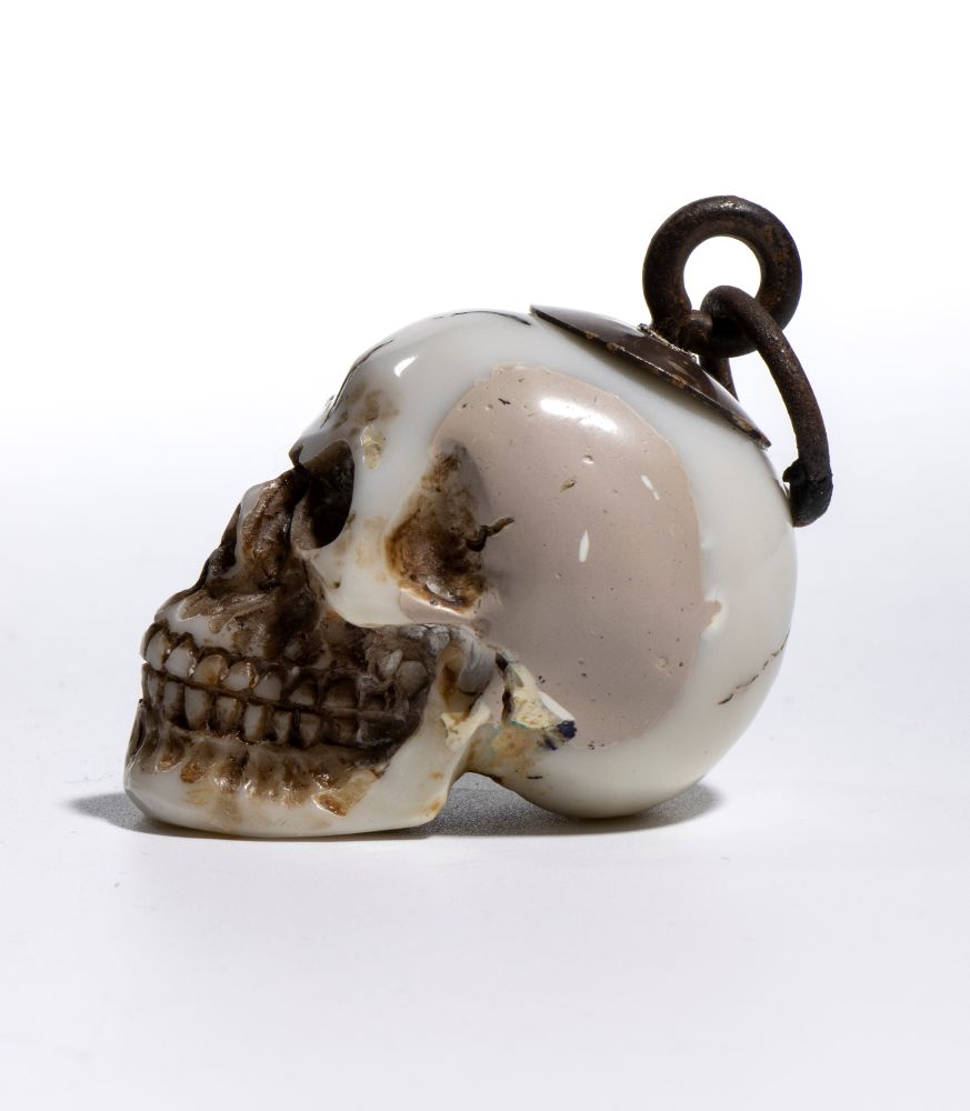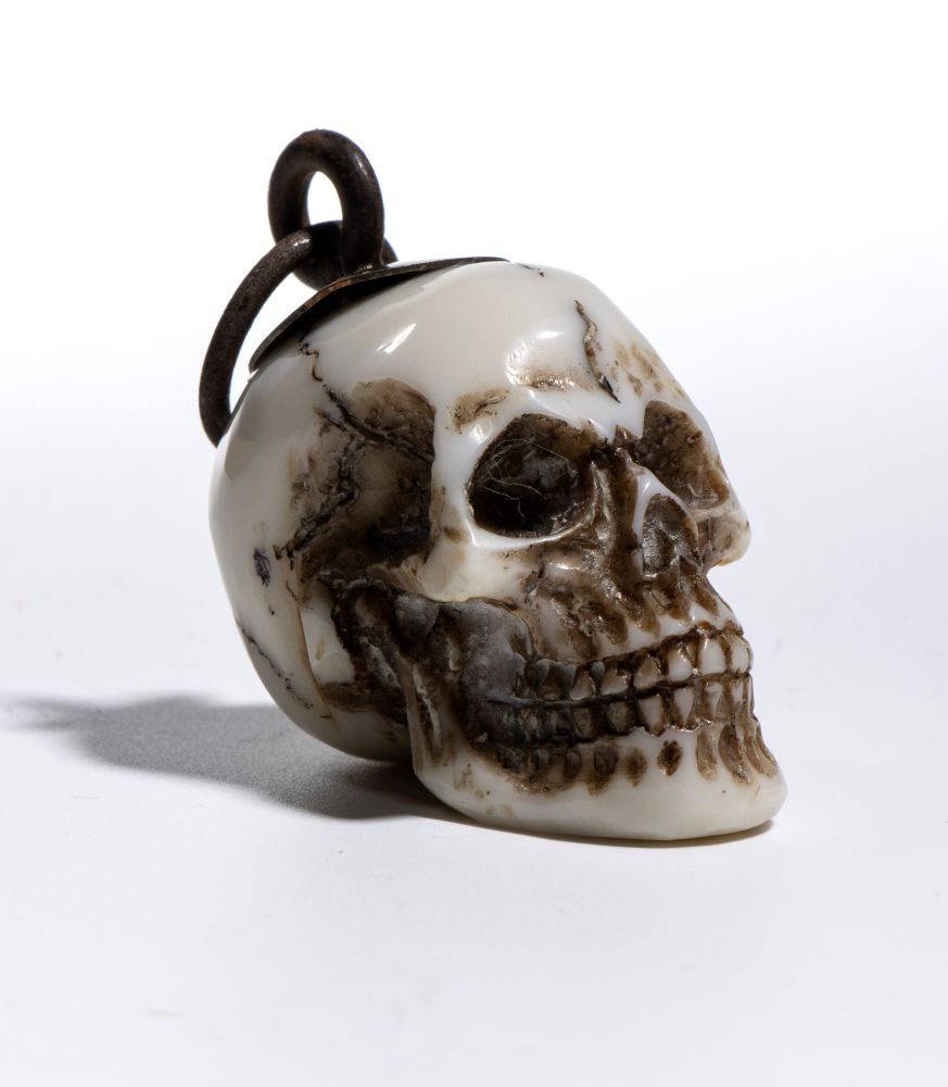Sulla sommità del teschio è applicato un gancio da cui parte un anello dello stesso materiale, pensato per permettere l’uso come pendente o amuleto. L’insieme conserva un carattere ornamentale, più estetico che rituale.