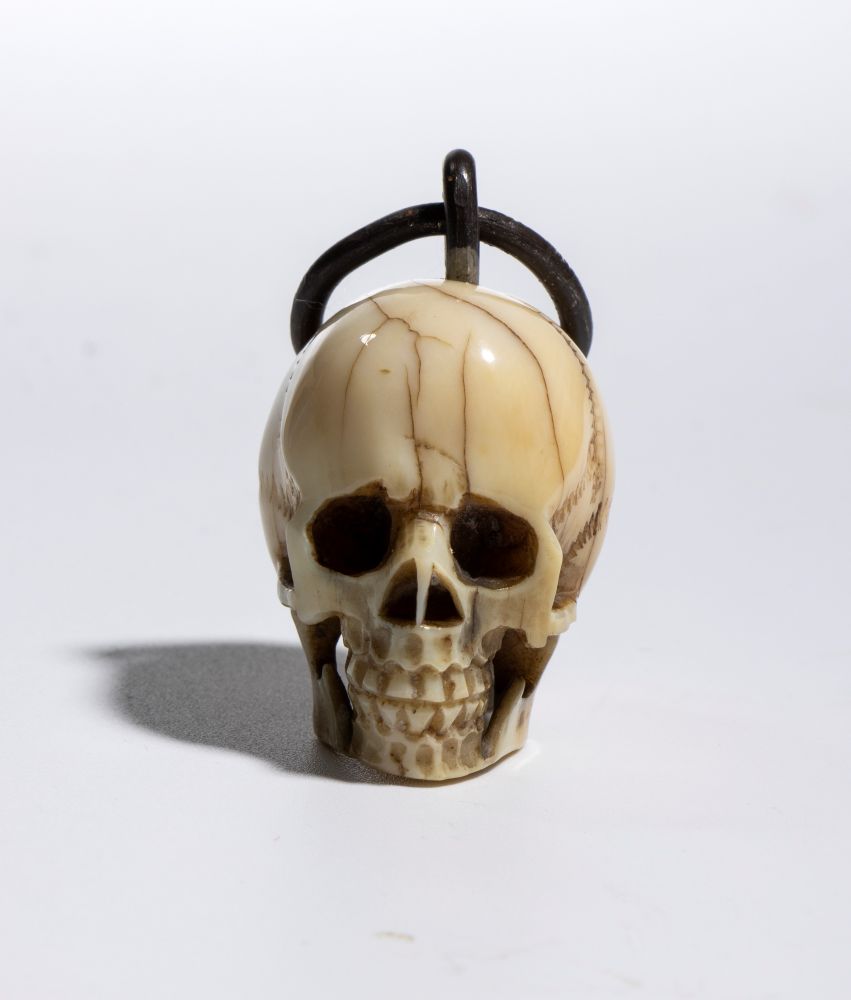 Sulla sommità del teschio è applicato un gancio da cui parte un anello dello stesso materiale, pensato per permettere l’uso come pendente o amuleto. L’insieme conserva un carattere ornamentale, più estetico che rituale.
