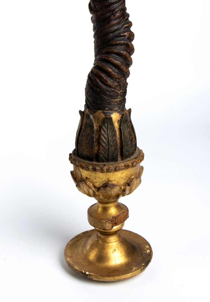 La base presenta nella parte superiore una raffinata decorazione a motivi fogliacei, ripetuta anche attorno all’attacco delle corna, quasi a incorniciare l’elemento naturale con un apparato decorativo che lo integra armoniosamente nell’insieme. L’effetto complessivo è quello di un oggetto da collezione o da Wunderkammer, in cui la natura viene nobilitata attraverso l’intervento artistico e la montatura preziosa.