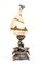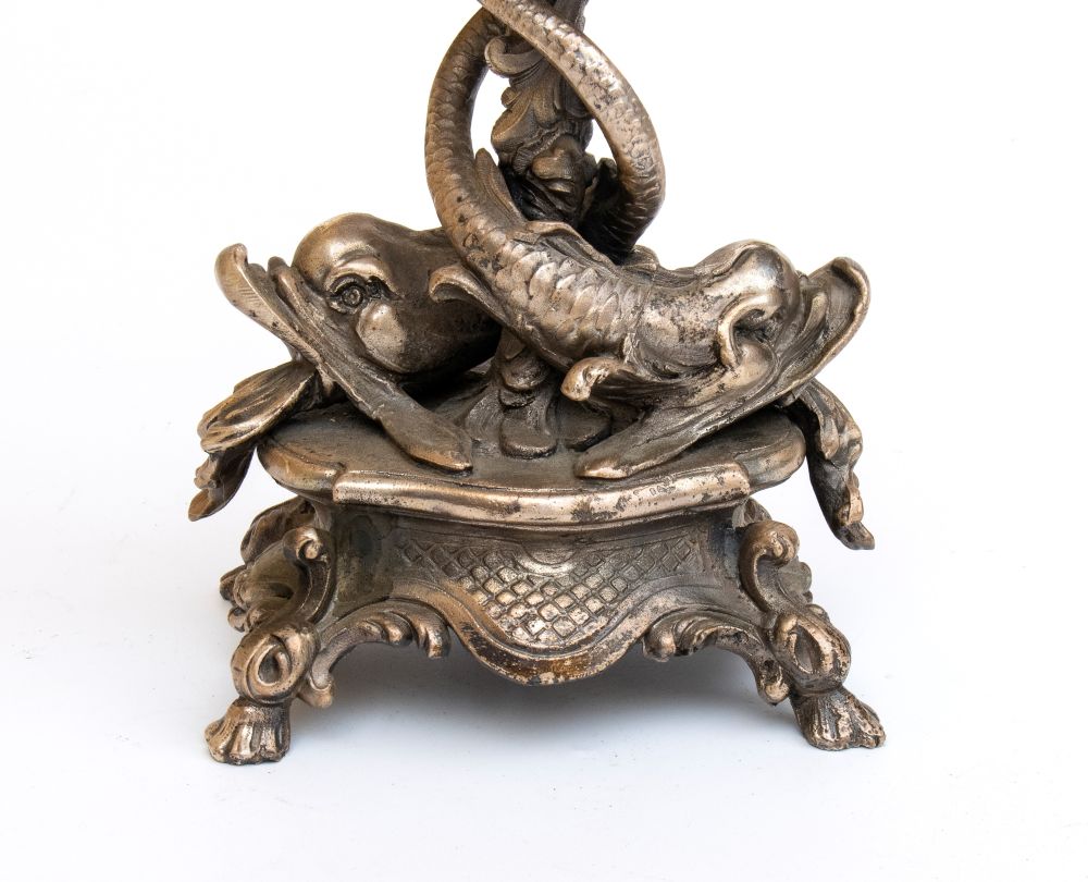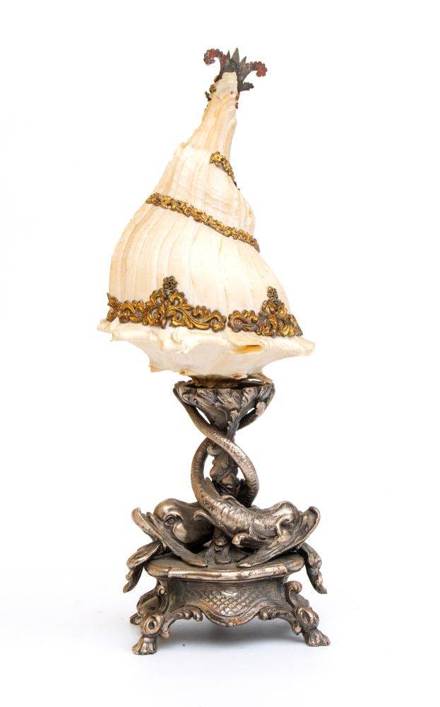 del genere Strombus finemente ornata da applicazioni in bronzo dorato con motivi vegetali e decorazioni a foglie d’acanto. La montatura poggia su una ricca base in metallo argentato modellata con delfini intrecciati e elementi rocaille di gusto neobarocco.