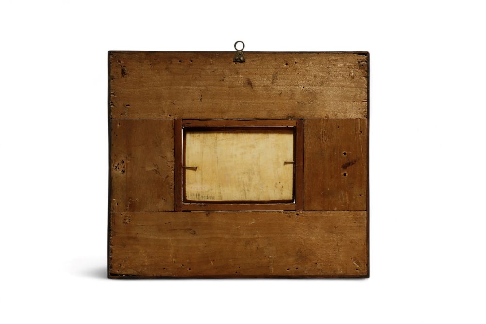 Antica placca in avorio di elefante (Elephas maximus Linnaeus, 1758 or Loxodonta africana Blumenbach, 1797) incorniciata in legno ebanizzato e decorata con sottili cornici dorate che si alternano al legno scuro, creando un elegante contrasto.