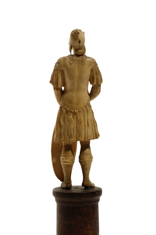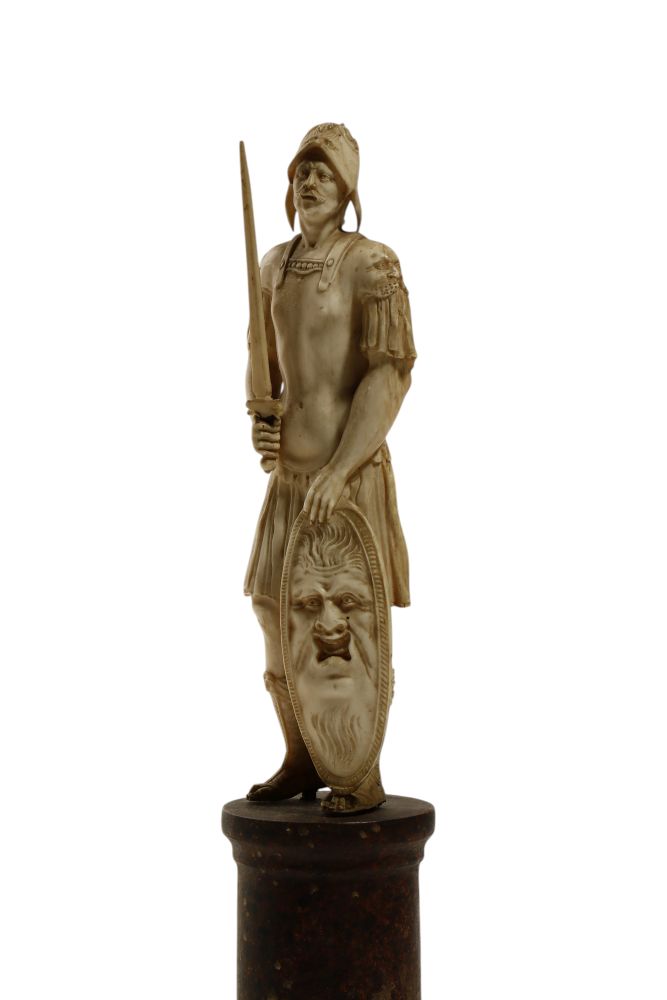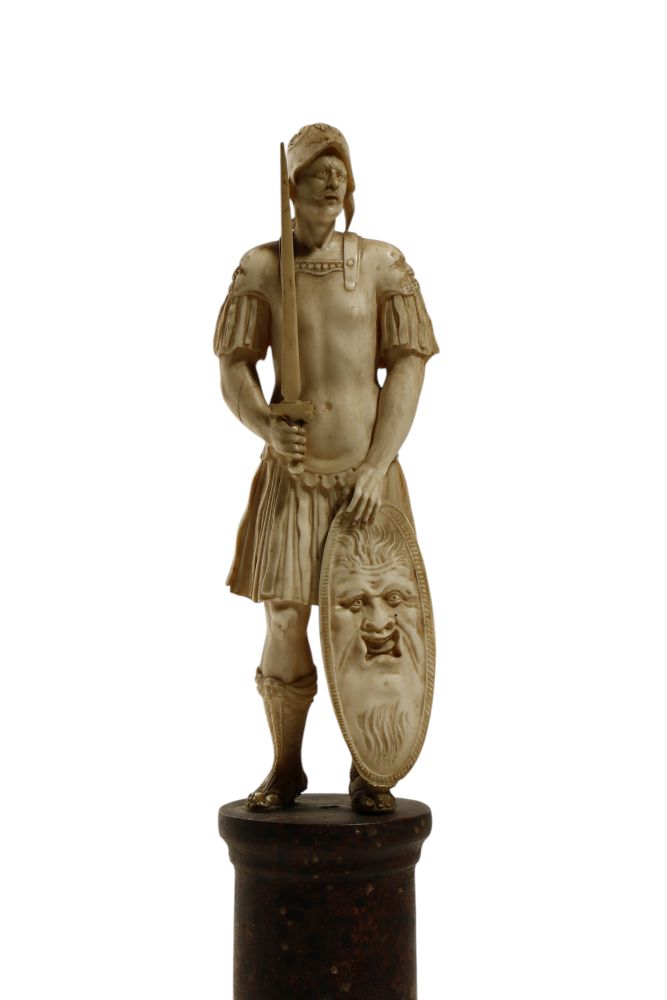 Antica scultura in avorio di elefante (Elephas maximus Linnaeus, 1758 or Loxodonta africana Blumenbach, 1797) finemente scolpita a tutto tondo a raffigurare un guerriero in piedi, vestito con una corta tunica militare e un elmo e stringe nella mano destra una spada mentre con la sinistra sostiene uno scudo ovale. Lo scudo è decorato con un volto grottesco dai tratti marcati, con barba fluente e bocca aperta, che richiama la tradizione apotropaica. L’immagine del guerriero rimanda all’idea di forza, valore e protezione, mentre lo scudo con la maschera rappresenta un mezzo di difesa non solo fisica ma anche simbolica, in quanto volto a respingere il male e spaventare i nemici. Questo motivo deriva dall’antichità classica, in particolare dal gorgoneion, il volto di Medusa usato sugli scudi come talismano, ma nel Rinascimento e nel Barocco venne rielaborato in chiave ornamentale con volti grotteschi o teatrali.