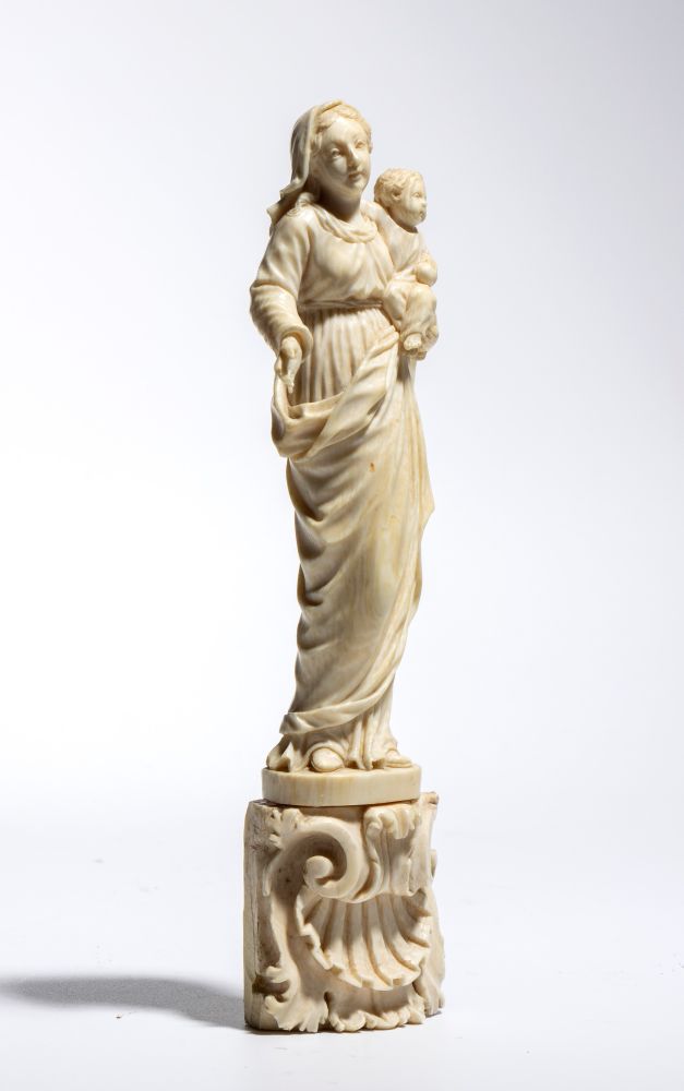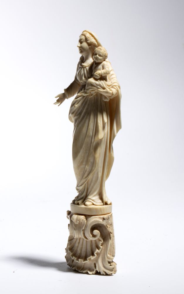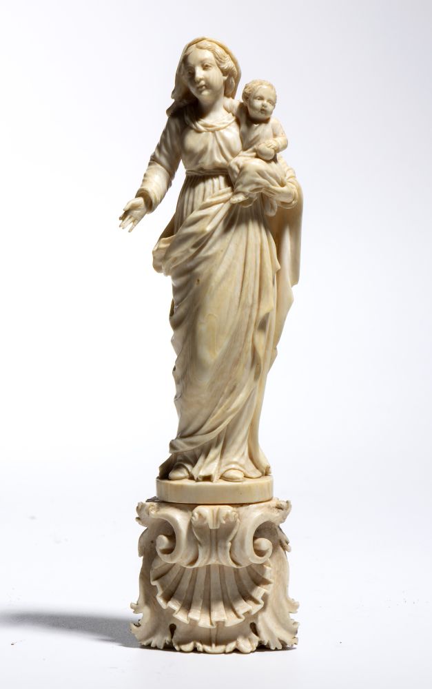 Scultura in avorio raffigurante Madonna con Bambino - Sicilia, fine XVII - inizio XVIII secolo