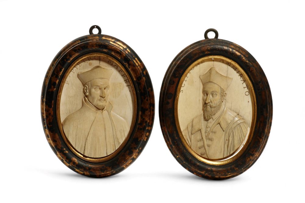 Antica coppia di placchette in avorio di elefante intagliato (Elephas maximus Linnaeus, 1758 or Loxodonta africana Blumenbach, 1797) raffiguranti al recto un busto maschile a rilievo accompagnato da iscrizioni identificative e al verso annotazioni biografiche, entro cornici dipinte in finta tartaruga.