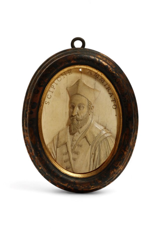 La seconda placca mostra il busto di un uomo con iscrizione superiore SCIPIONE AMMIRATO, identificabile con lo storico fiorentino Scipione Ammirato (1531–1601); al verso la trascrizione recita: “An Eminent Historian … the History of Florence born at Naples died at Florence aged 36 A.D. 1629”. Una parola non risulta leggibile, mentre la data sembra discrepante rispetto alla biografia conosciuta e potrebbe derivare da un errore di trascrizione o da una copia tarda.