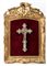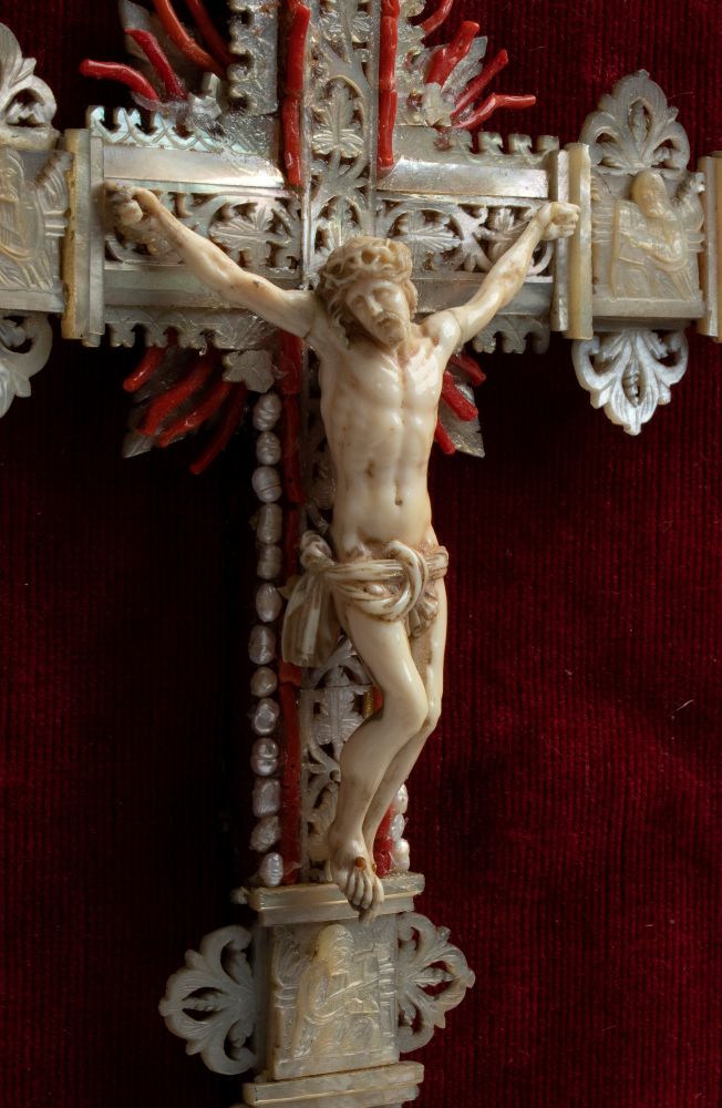 finemente scolpito. Le proporzioni armoniose, l’espressione sofferta ma composta e il panneggio del perizoma, reso con morbide pieghe, contribuiscono a un insieme raffinato. La croce su cui è montata la scultura è interamente rivestita in madreperla, lavorata a traforo e intarsiata con motivi ornamentali tipici degli oggetti devozionali di lusso. Ai terminali e nei punti di raccordo tra i bracci sono inseriti piccoli elementi di corallo rosso. Il crocifisso è inserito in una importante cornice dorata, riccamente lavorata con volute, fogliami e motivi a conchiglia che rimandano a un gusto barocco o rococò. Il fondo in velluto rosso intensifica ulteriormente il contrasto con la croce.