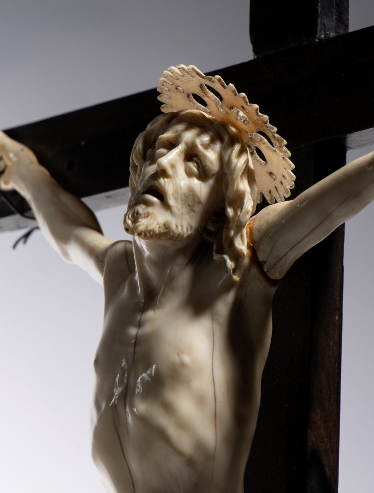 Separatamente sono presenti un cartiglio con il Titulus crucis INRI (Iesus Nazarenus Rex Iudeorum, che si traduce letteralmente in “Gesù nazareno, re dei giudei”), titolo imposto a Cristo secondo la tradizione evangelica, e dei capicroce in avorio. Il corpo di Gesù è teso nella drammaticità del sacrificio, con i muscoli del busto e degli arti scolpiti con precisione. Le mani inchiodate trasmettono un senso di dolore e rassegnazione, mentre la testa ricade sul lato sinistro con la bocca aperta e gli occhi aperti e sofferenti rivolti al cielo, evocando così l'ultimo respiro e suggellando un momento di intensa spiritualità. Sulla sommità della testa è presente una particolare corona, un nimbo raggiato, cioè una sorta di aureola circolare composta da raggi appuntiti. La morbida e ricciuta capigliatura e la barba, ricadono sulle spalle incorniciando il volto. Il busto scolpito con tensione dinamica mostra con evidenza i muscoli addominali contratti, mentre le gambe mostrano la tensione della figura, portando lo sguardo ai piedi sovrapposti e inchiodati con un unico chiodo. Il perizoma non è di grandi dimensioni, mostra un cordone annodato sul fianco destro e un panneggio morbido e leggermente mosso che lo circonda. Il Cristo poggia su una croce in ebano posta su una base triangolare a gradini, poggiante su piedini in avorio. La croce presenta dei capocroce anch’essi in avorio di elefante.