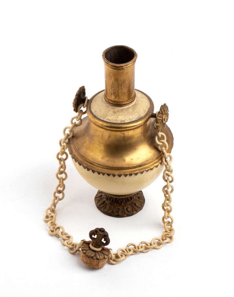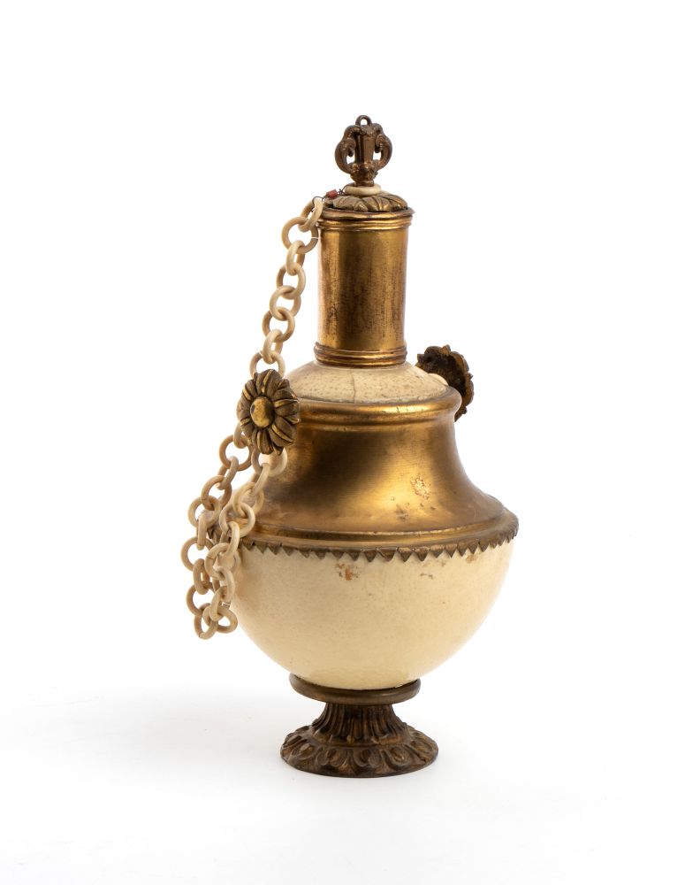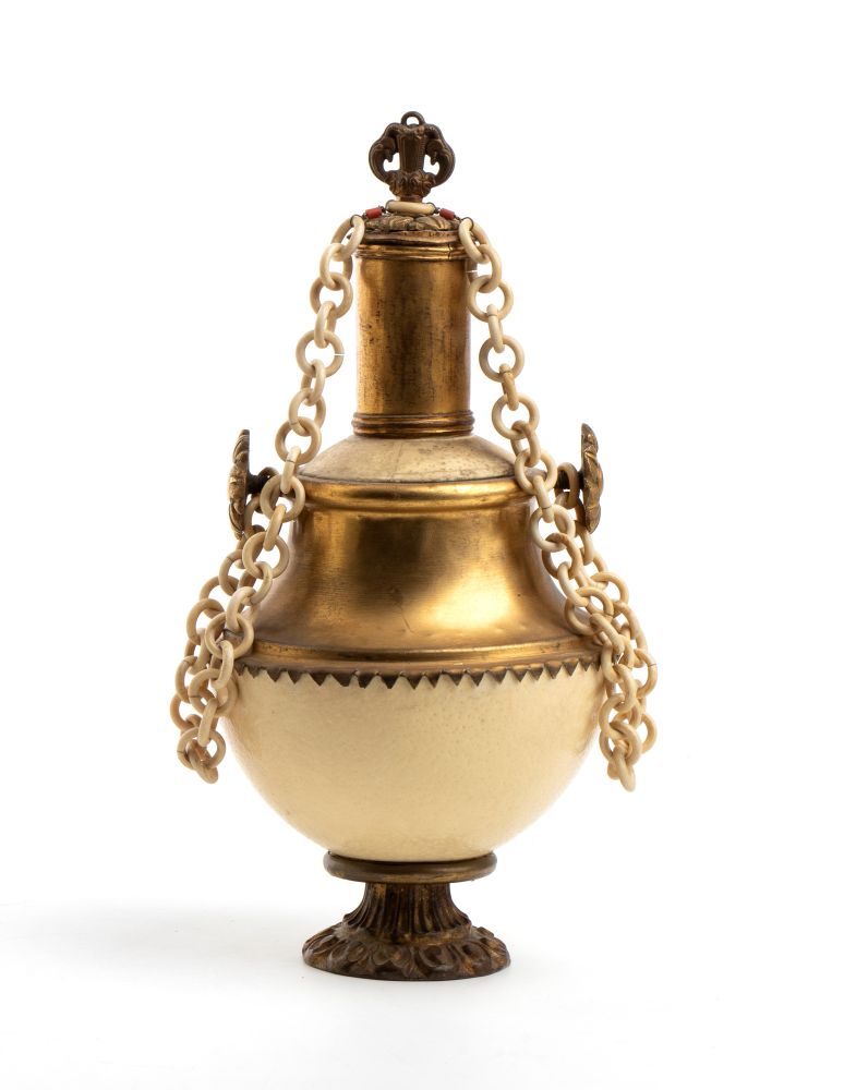 Antica bottiglia avente il corpo in uovo di struzzo, con elementi in bronzo dorato e avorio di elefante (Elephas maximus Linnaeus, 1758 or Loxodonta africana Blumenbach, 1797).