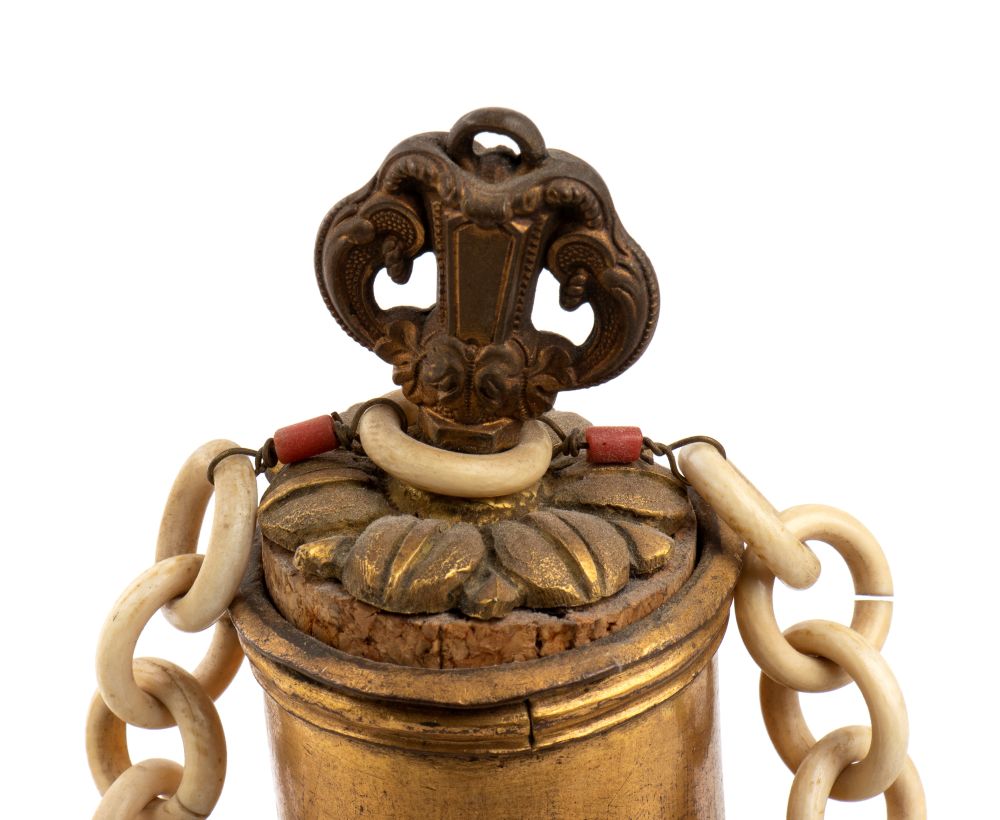 Il corpo, poggiante su una base circolare in bronzo dorato decorata perimetralmente con elementi fogliati, presenta un collo fortemente svasato; la parte superiore, anch’essa in bronzo dorato, è costituita da un elemento cilindrico con coperchio ad innesto cimato da un fastigio che richiama forme araldiche o floreali. Ai lati del corpo sono presenti due manici a motivo floreale, ai quali sono fissate due catene composte da maglie circolari in avorio con terminali cilindrici in corallo rosso del Mediterraneo (Corallium Rubrum) che fungono da raccordo con il terminale del tappo.