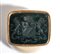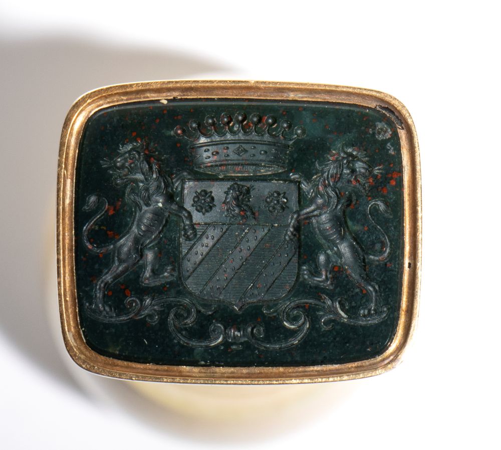 La base, realizzata in oro rosa, è decorata con un motivo a scanalatura verticali e orizzontali, perfettamente adeguato all’estetica francese dell'epoca. Il sigillo è inciso su una pietra di diaspro. La matrice reca uno stemma araldico raffigurante uno scudo sorretto da due leoni rampanti e sormontato da una corona, chiaro simbolo di appartenenza nobiliare.