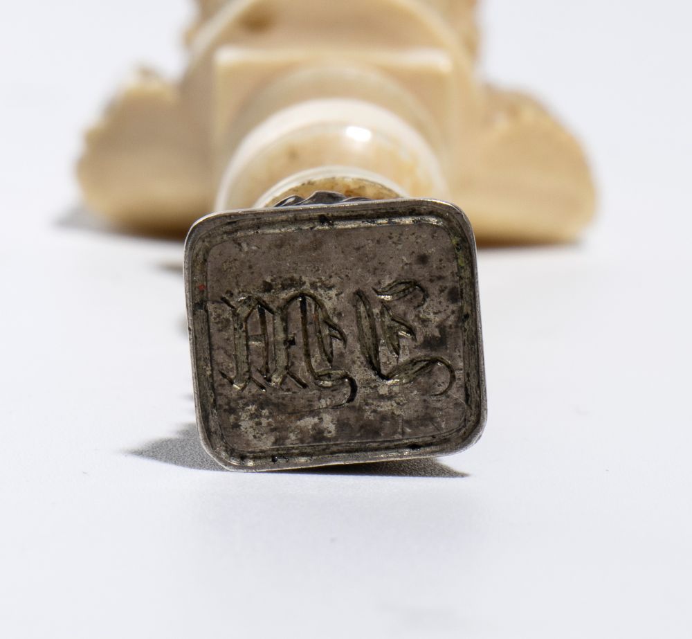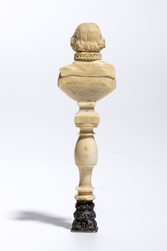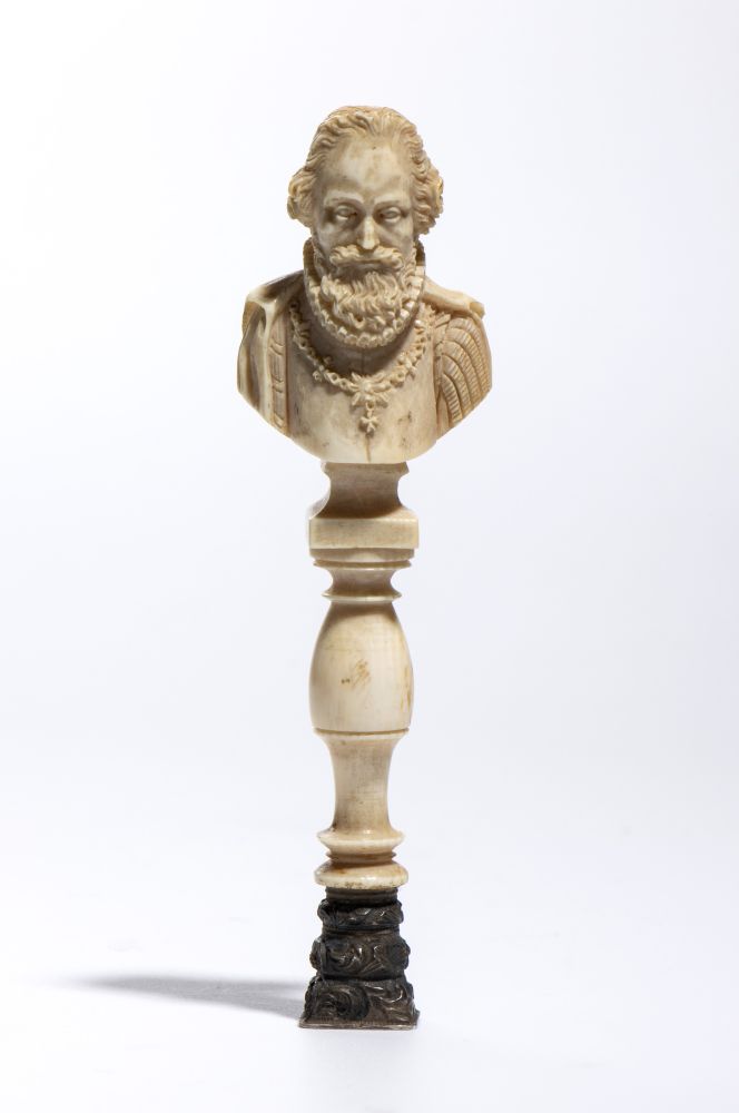 La parte superiore è scolpita a tutto tondo e rappresenta il busto di un personaggio maschile maturo, con una folta barba e capelli ondulati. Indossa un'armatura decorata e una collana con un pendente a forma di croce, probabilmente un'insegna cavalleresca, dettaglio che ne sottolinea il rango elevato, forse appartenente alla nobiltà militare o a un ordine cavalleresco. La posa dignitosa, il volto serio e la lavorazione minuziosa del busto (in particolare l’elaborazione delle ciocche di barba e capelli) sono indicativi di una committenza prestigiosa. La figura è collocata su una colonna tornita che funge da impugnatura al sottostante sigillo in argento decorato con elementi vegetali in rilievo. Il busto potrebbe rappresentare un personaggio storico o essere ispirato a un sovrano militare o a un condottiero famoso. Alcuni indizi, come la barba folta, il volto nobile e la decorazione della croce, fanno pensare a figure come Enrico IV di Francia (1553–1610), noto per essere stato il primo re Borbone di Francia, spesso rappresentato proprio con barba piena, armatura e decorazioni cavalleresche.