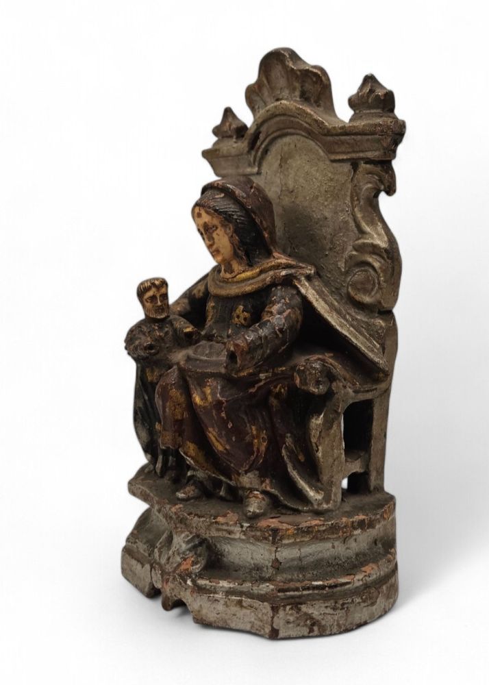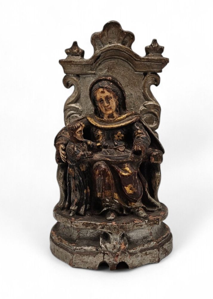 La composizione presenta al centro una figura femminile con nimbo, probabilmente Sant’Anna, seduta su un trono decorato, con il velo che incornicia il volto scolpito in avorio. Alla sua sinistra si nota una figura più piccola, probabilmente un bambino, anch’egli reso con notevole dettaglio.
