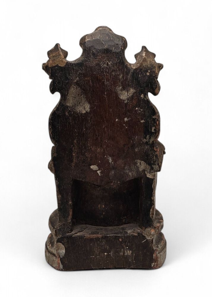 Il trono presenta una struttura barocca, con elementi decorativi tipici del gusto europeo, ma rielaborati attraverso la sensibilità artistica locale, dando vita a un’opera che fonde estetica occidentale e tecniche orientali. Le tracce di doratura e la policromia consumata testimoniano l'antichità dell'opera e il suo uso devozionale.