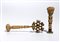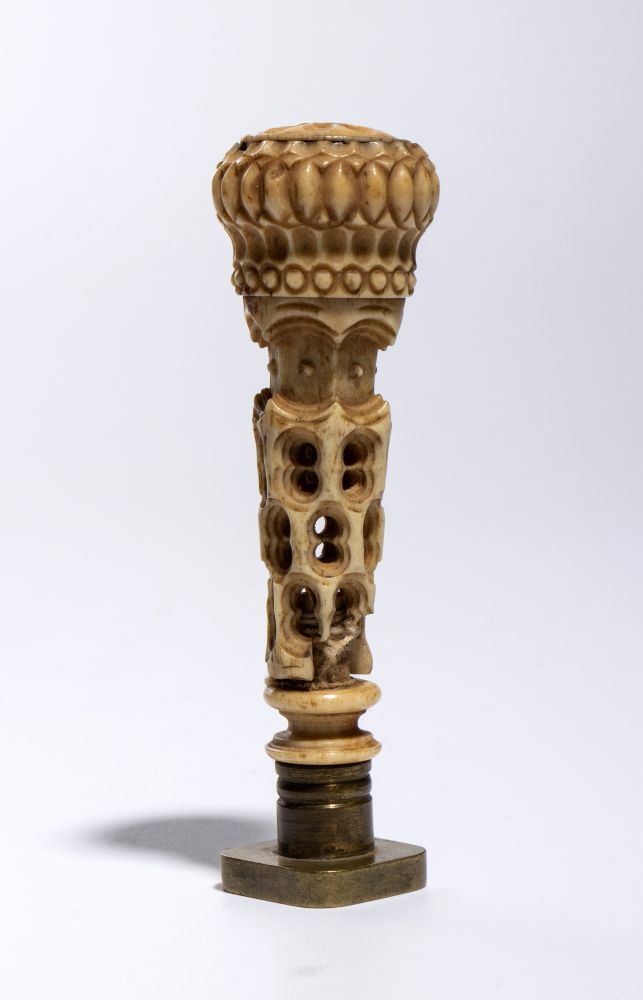 Il primo sigillo presenta un’impugnatura affusolata, tornita in forma circolare, caratterizzata da una delicata decorazione a motivi geometrici lungo tutta la sua lunghezza. La parte inferiore del manico si distingue per elementi traforati. La base del sigillo è di forma quadrata e reca inciso uno stemma araldico.