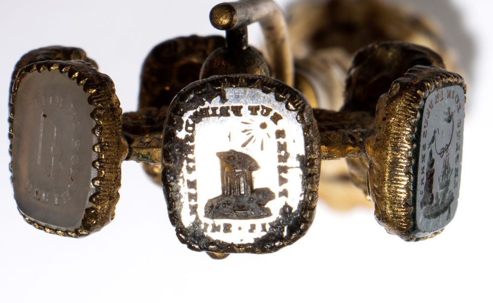 Il secondo sigillo conserva la stessa elegante linea affusolata e la decorazione della parte superiore del manico, ma si distingue per la presenza di un ingegnoso meccanismo rotante. Questo sistema a ruota permette di scegliere tra diversi sigilli realizzati in pietre dure di varia tipologia, ognuno recante uno stemma araldico distinto.