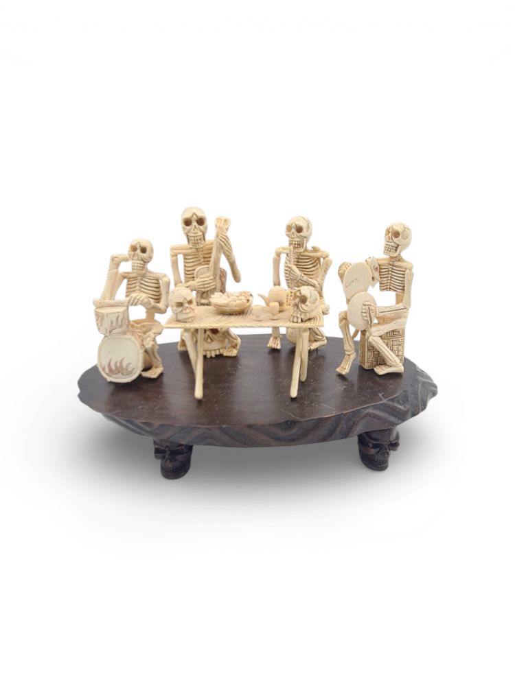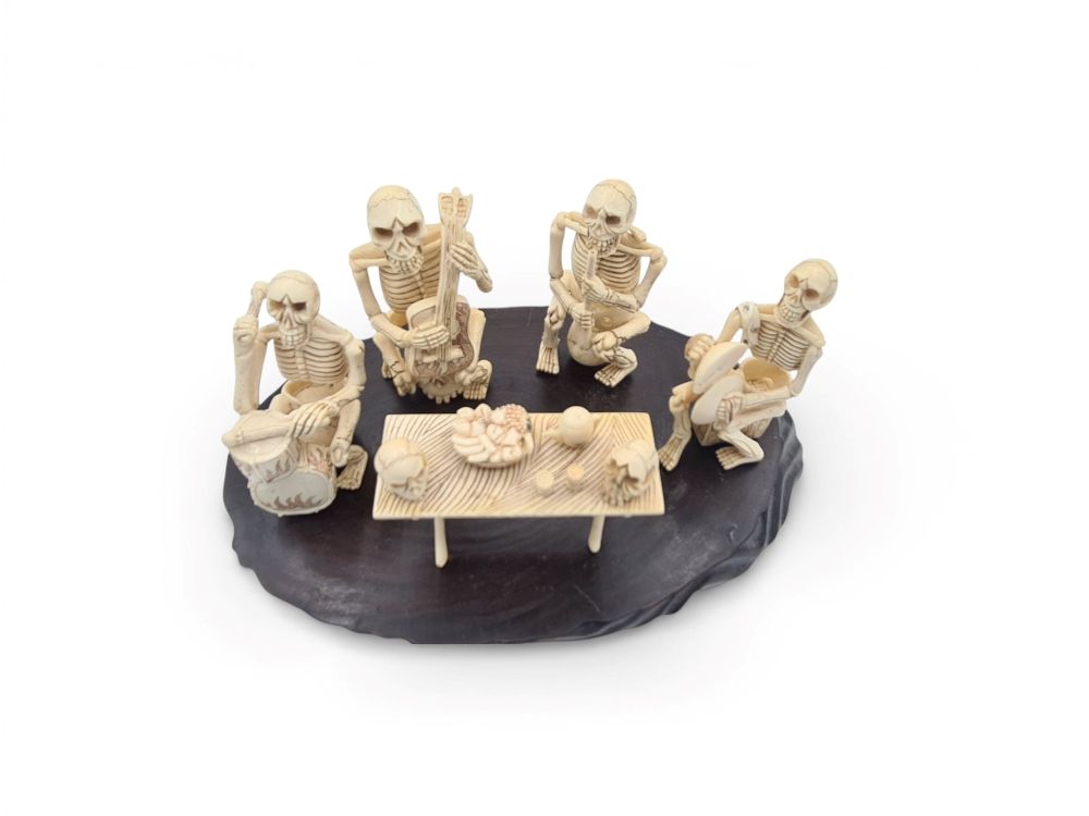 Rappresenta una scena vivace e simbolica in cui quattro scheletri sono intenti a suonare strumenti musicali e a condividere un momento conviviale attorno a un tavolo. L'opera, caratterizzata da una finissima lavorazione, esemplifica la maestria artigianale dell'epoca e il gusto per la rappresentazione di scene animate e dettagliate. Gli scheletri presentano espressioni e posture dinamiche, che conferiscono alla composizione un senso di movimento e realismo. Ogni figura è impegnata in un'azione distinta: uno suona un tamburo decorato con motivi fiammeggianti, un altro pizzica le corde di uno strumento a corda simile a un liuto, mentre gli altri due tengono strumenti a percussione e a fiato. Al centro della scena si trova un tavolo ornato con dettagli minuziosi, sopra il quale sono disposti ciotole con frutta, una teiera e teschi.