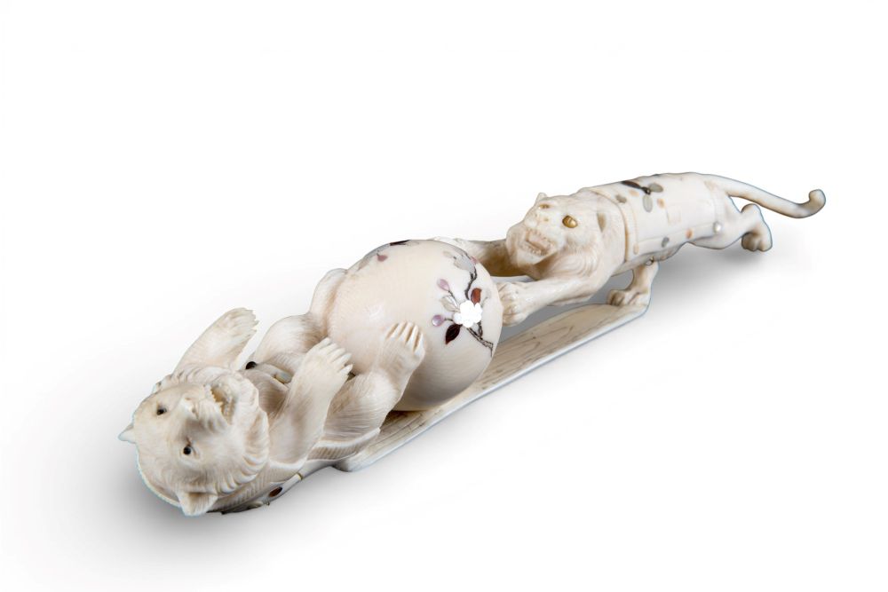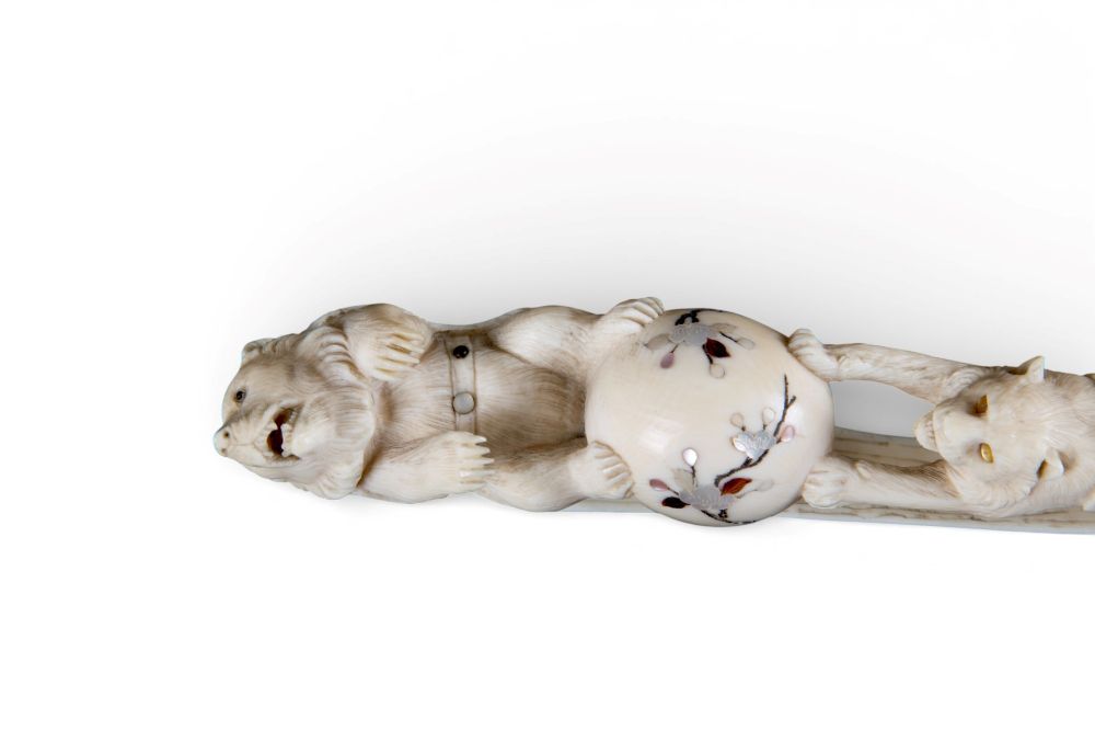 di elefante (Elephas maximus Linnaeus, 1758 o Loxodonta africana Blumenbach, 1797) e madreperla, raffigurante un orso con una tigre.