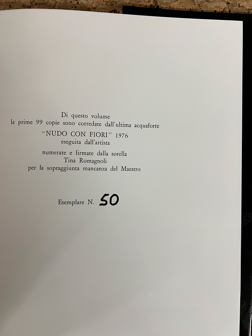 Il presente esemplare è arricchito dalla presenza dell'ultima acquaforte realizzata dall'Artista, intitolata 'Nudo con fiori' e recante firma e numerazione (Esemplare 50/99) a matita al fronte di Tina Romagnoli (in seguito alla sopraggiunta mancanza del Maestro)