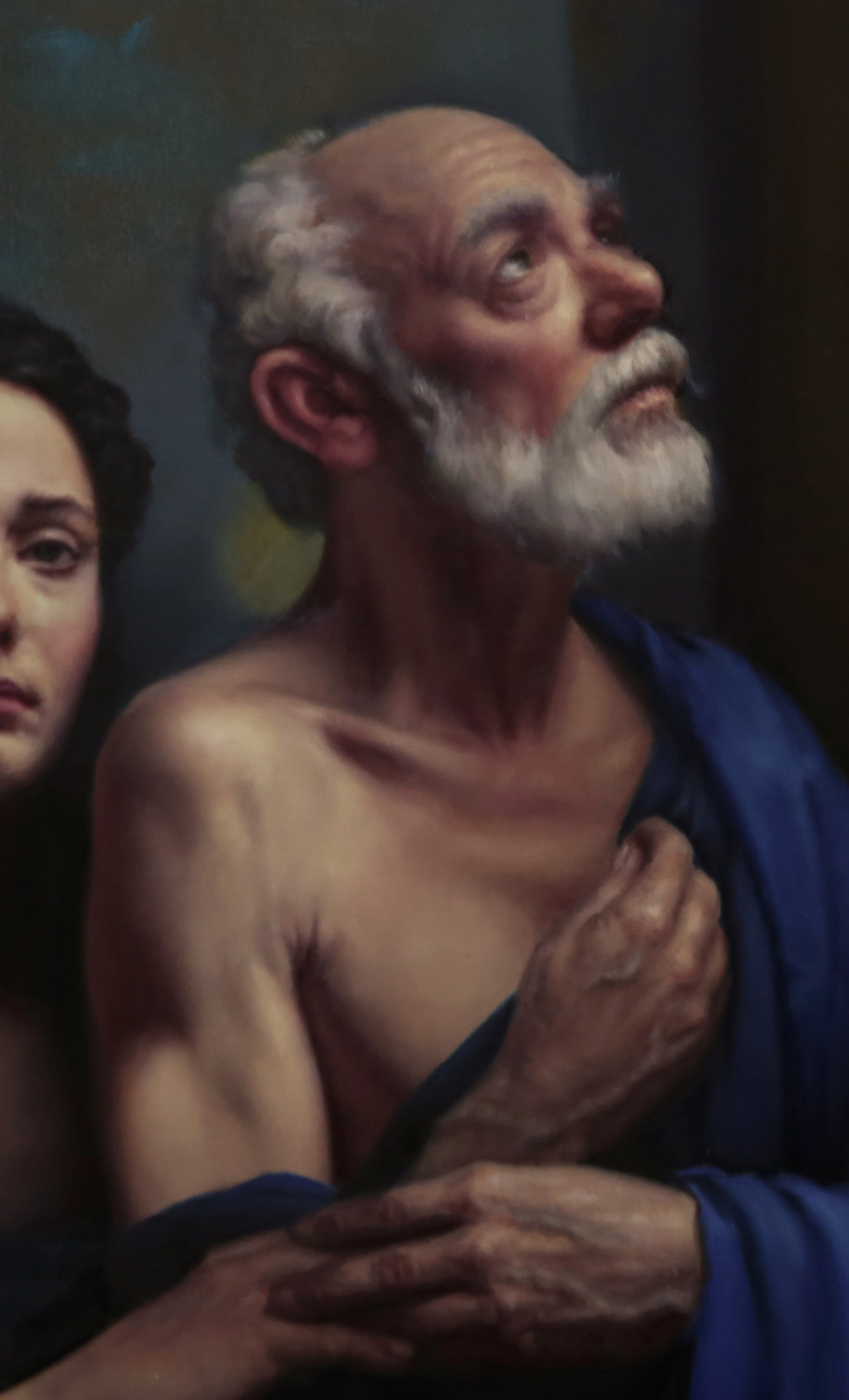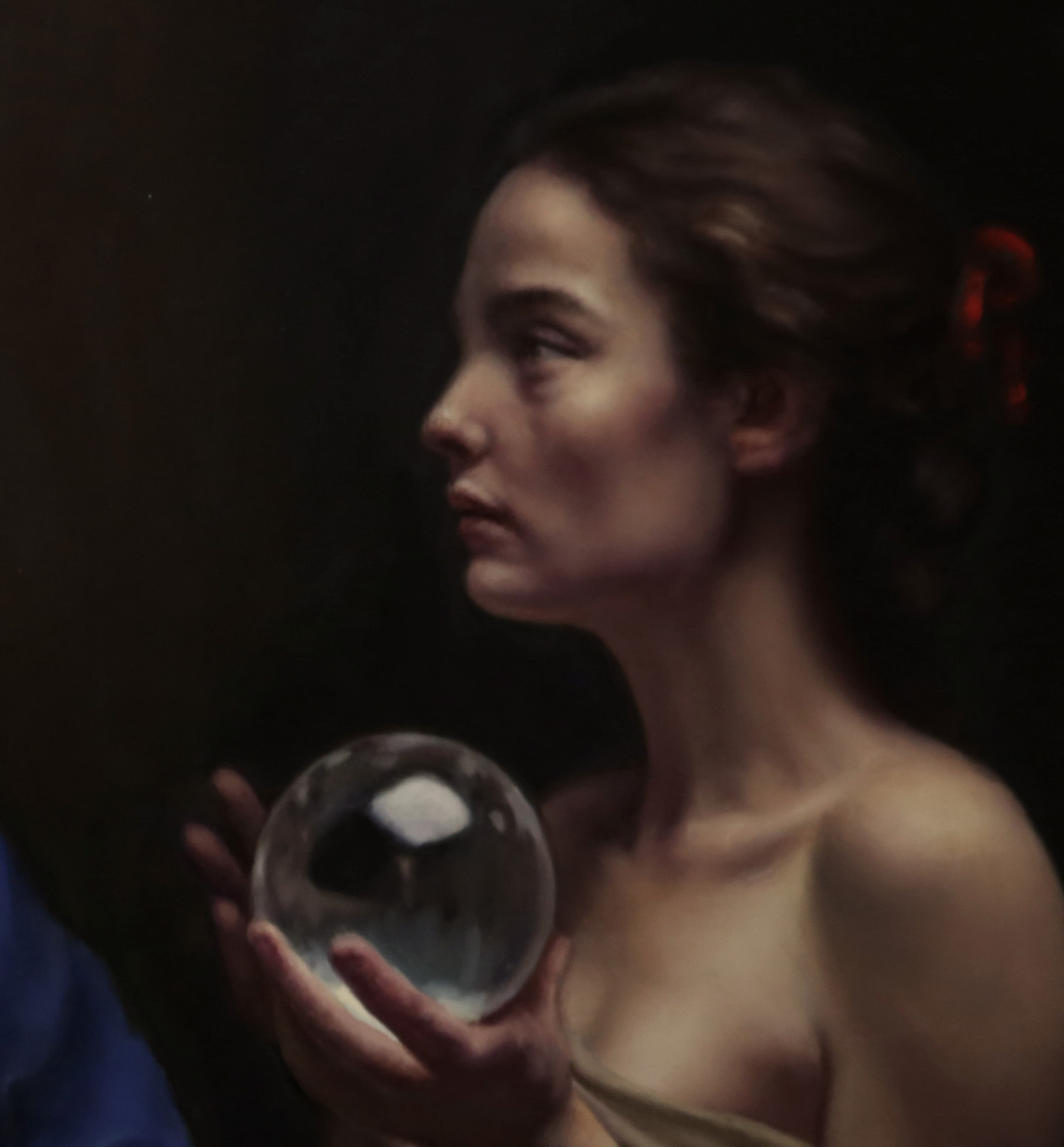Per quanto riguarda l’aspetto tonale, l’artista evita la facile scelta di rossi intensi nei panneggi, perché in questo caso avrebbero assorbito i rossi dell’incarnato. Creare magia cromatica e armonia significa anche essere consapevoli degli inganni della percezione visiva. Il più comune è il fenomeno del richiamo: usare toni simili in diversi punti della tela può generare effetti inverosimili, polarizzare l’attenzione o disturbare la lettura del dipinto, come se i colori emettessero un “rumore” visivo che distrae.