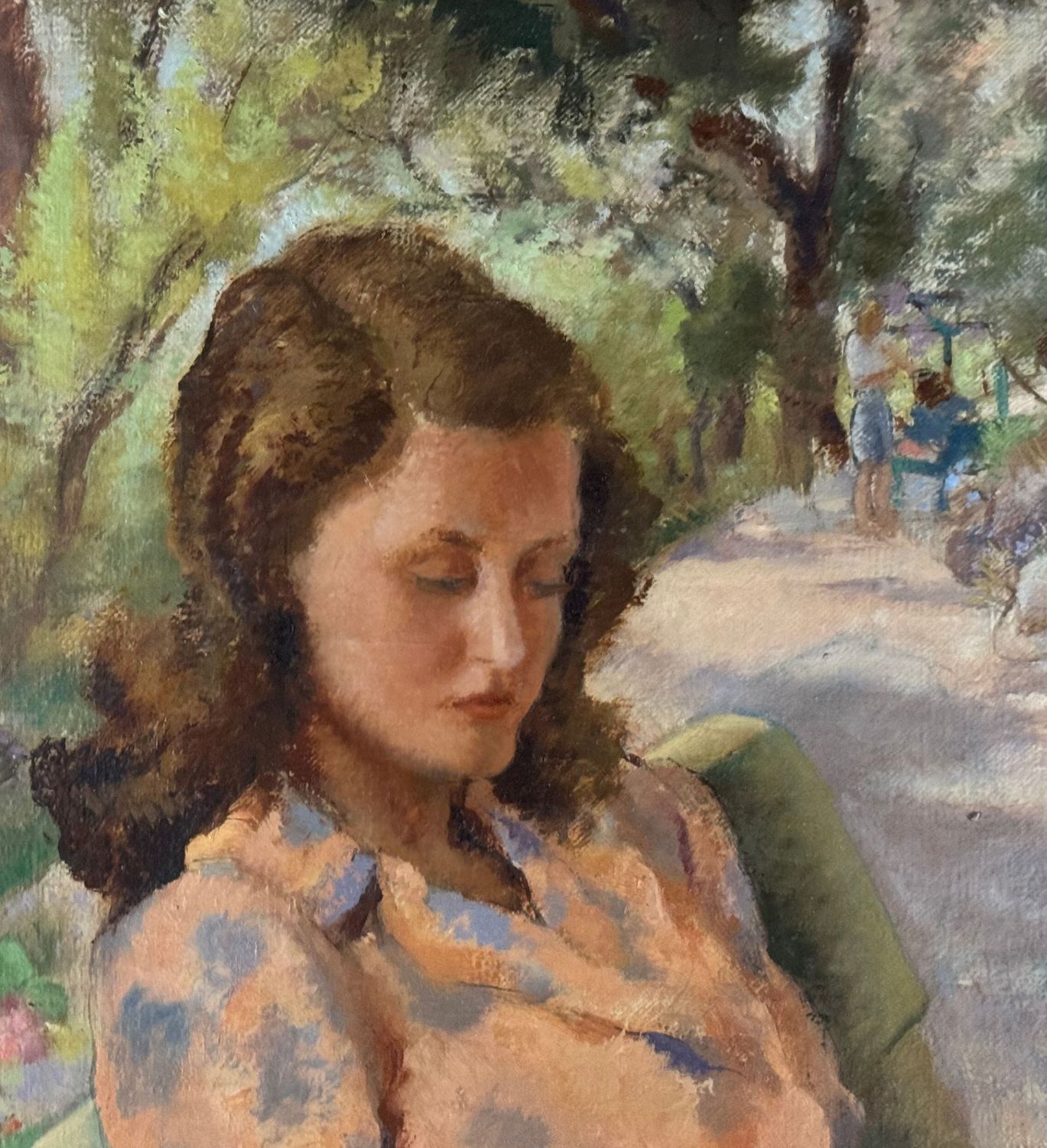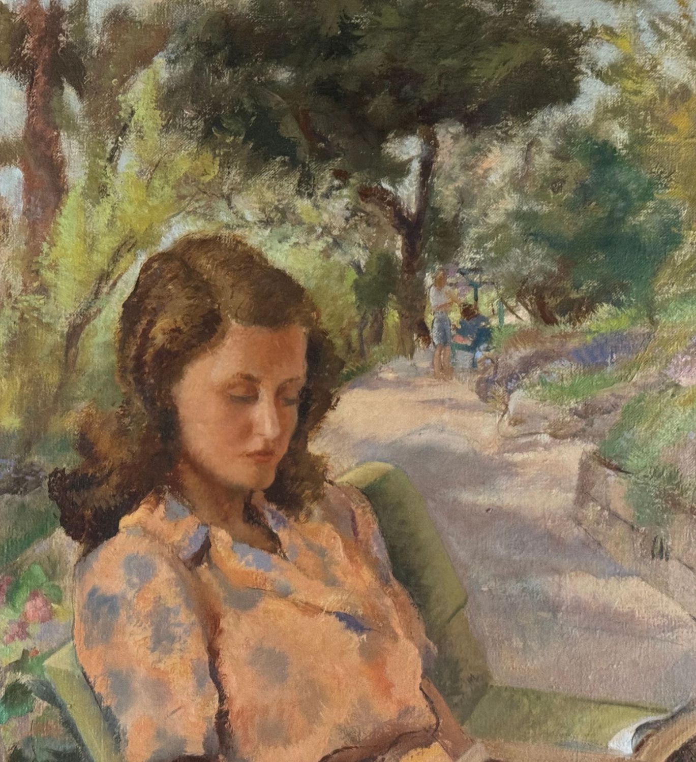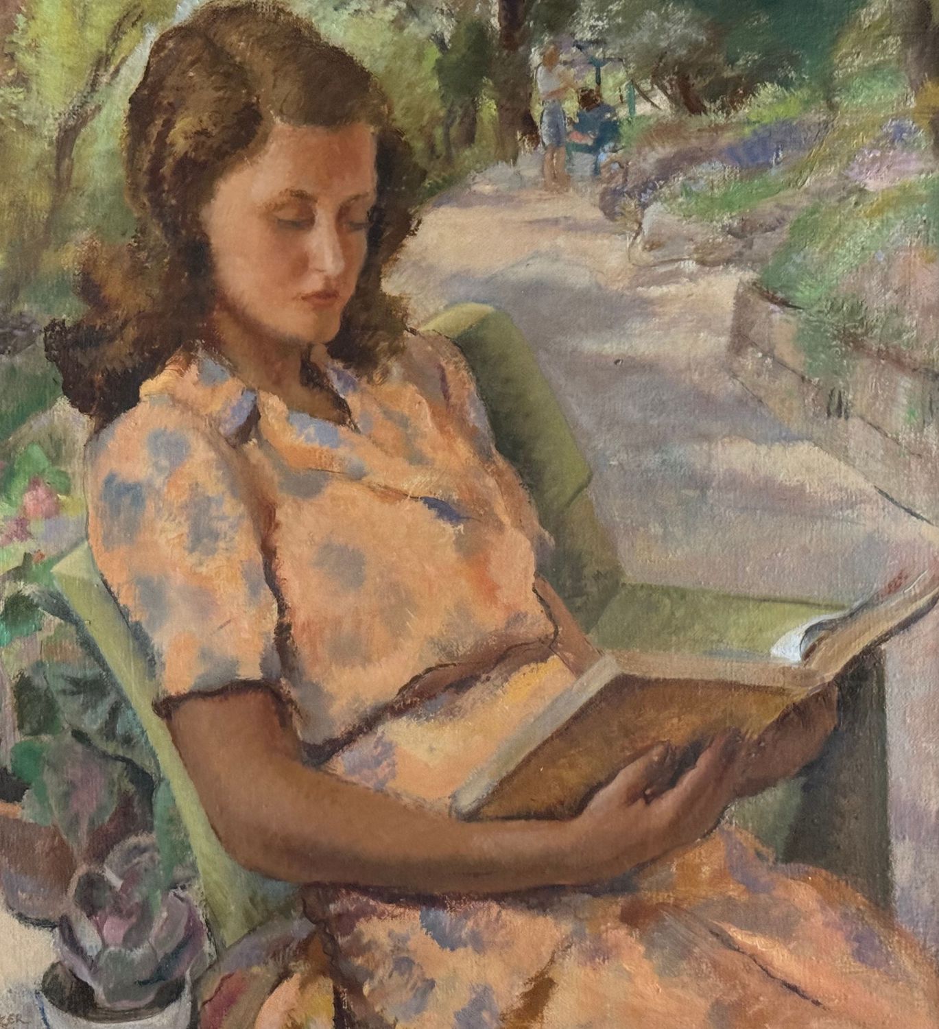 Dipinto olio su tela, periodo XX secolo, scuola Italiana, raffigurante Giovane donna che legge al parco. Dimensioni comprese cornice: 74x94 cm. Dimensioni interno cornice: 62x82 cm. Firmato in basso a sinistra Eligio Finazzer Flori. Reca cartiglio sul retro dell’Archivio Storico di Arte Contemporanea, 22ª Biennale di Venezia. Opera in buone condizioni e di eccellente qualità artistica.