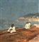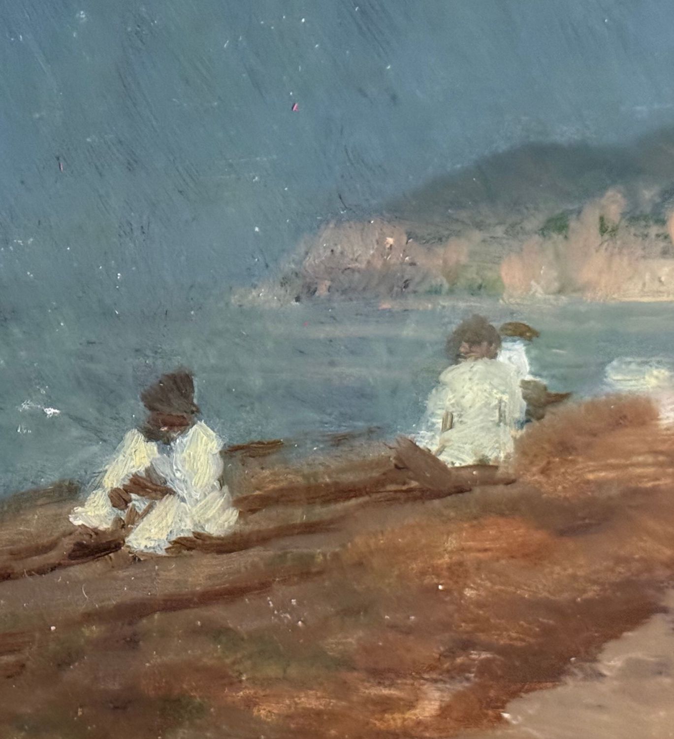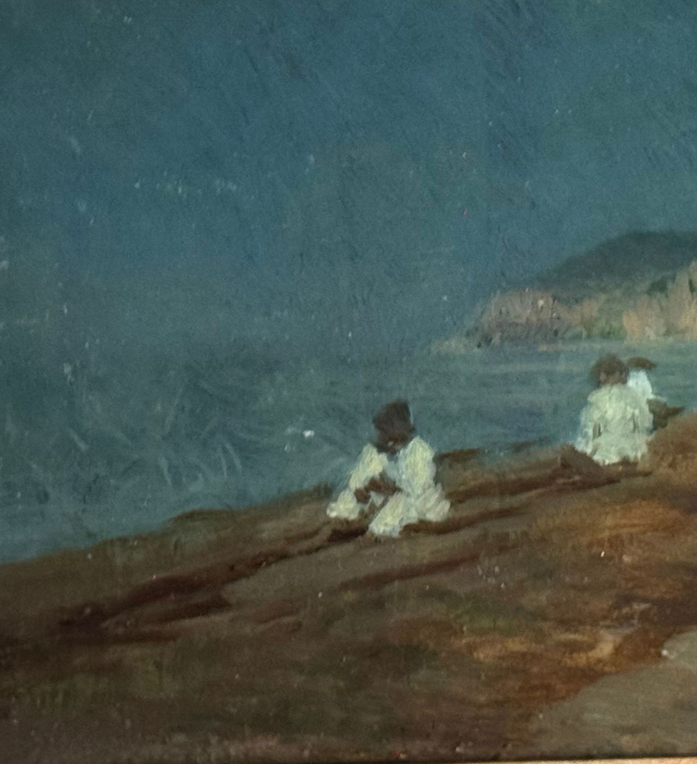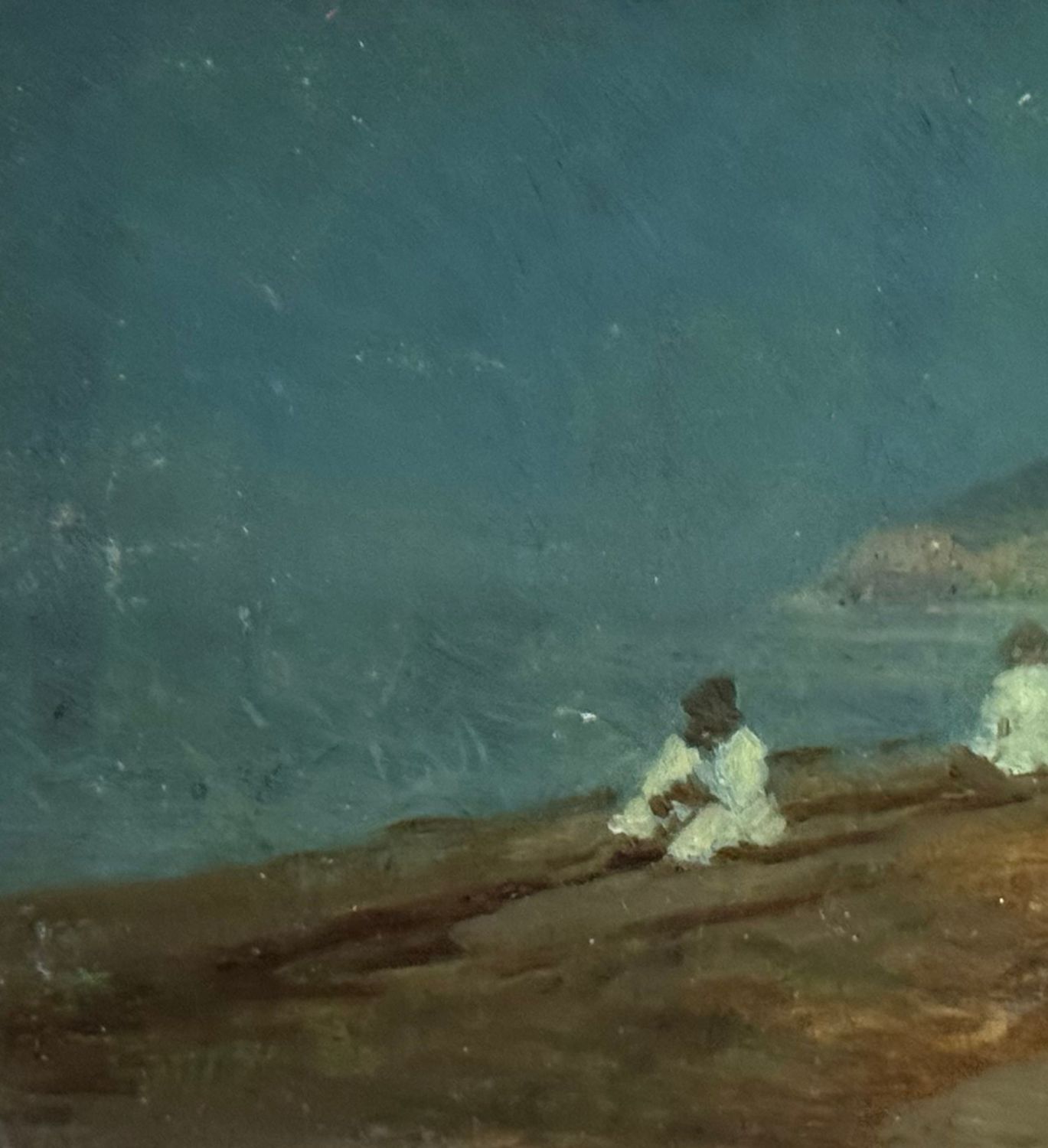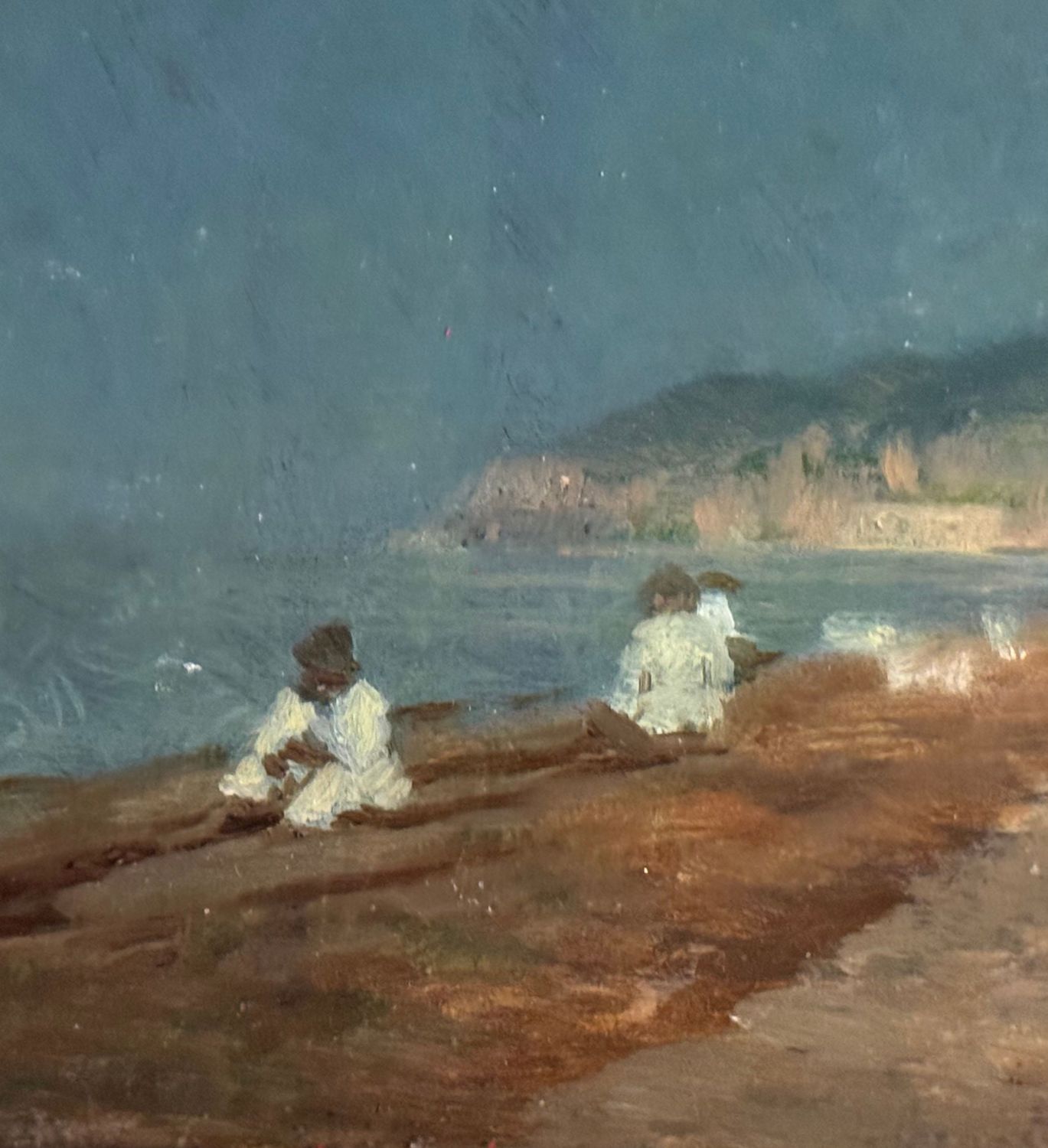 Dipinto olio su tavola, periodo XIX secolo, scuola Italiana, raffigurante Marina con personaggi. Dimensioni compreso cornice: 37x27 cm. Dimensioni interno cornice: 24x14 cm. Reca firma in basso a destra De Nittis. Opera in buone condizioni.
