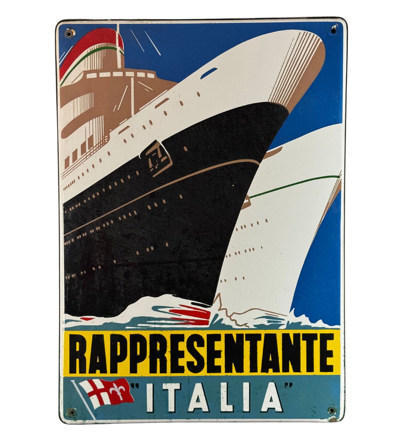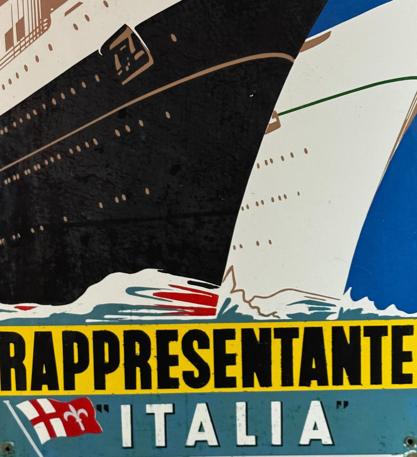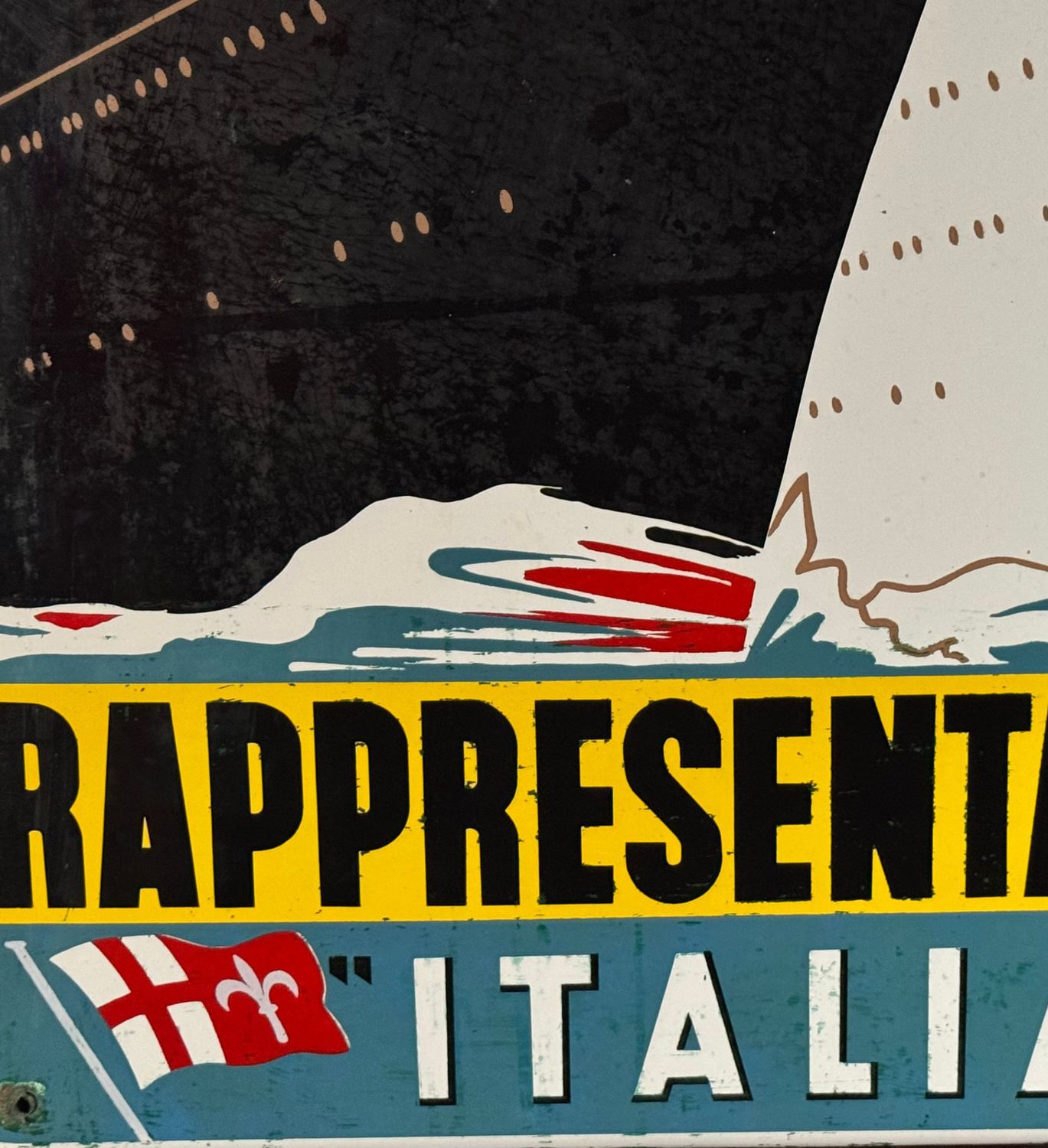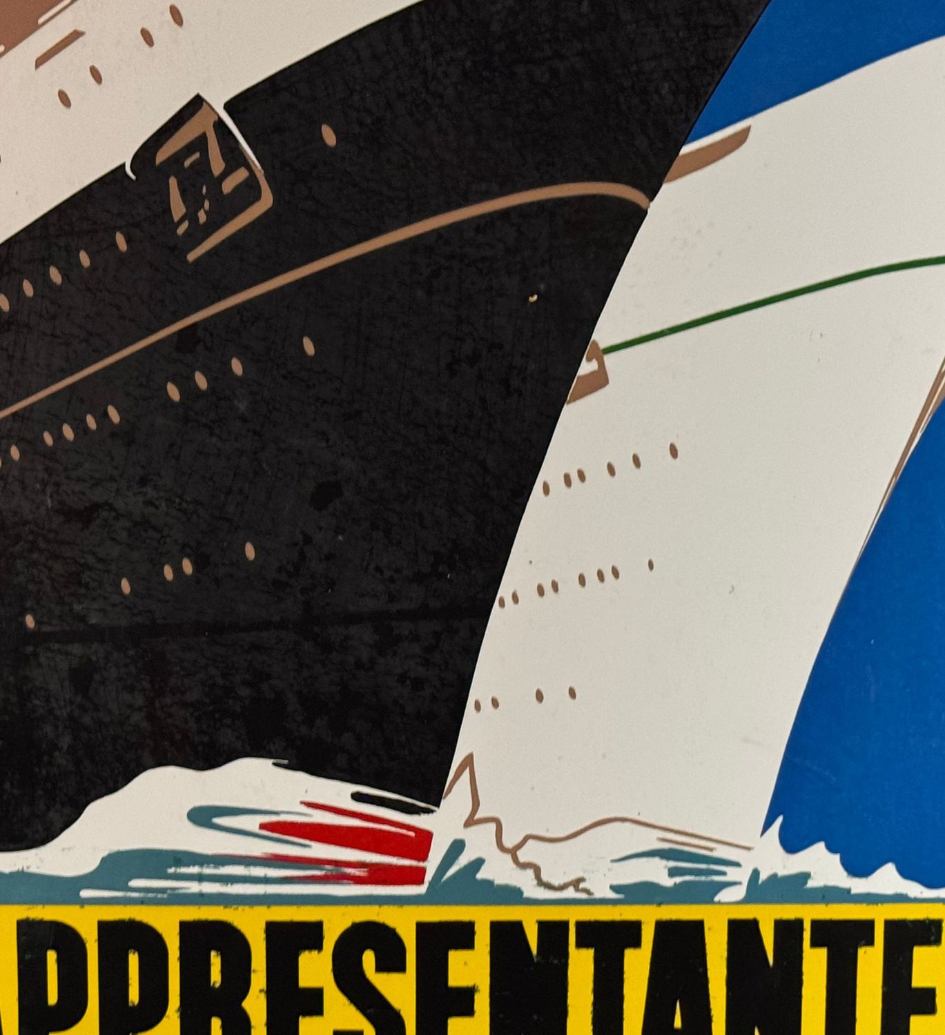 Insegna smaltata originale di (rappresentanza italiana), prodotta dalla Smalteria Perego di Trezzo tra il 1930 e il 1950. Dimensioni: 70 × 50 cm. L’insegna presenta una grafica di gusto futurista raffigurante due navi in navigazione, riconducibili all’Andrea Doria e al Cristoforo Colombo. Proveniente da collezione privata, si presenta in buone condizioni generali, con lievi segni di vissuto, come da foto allegate.