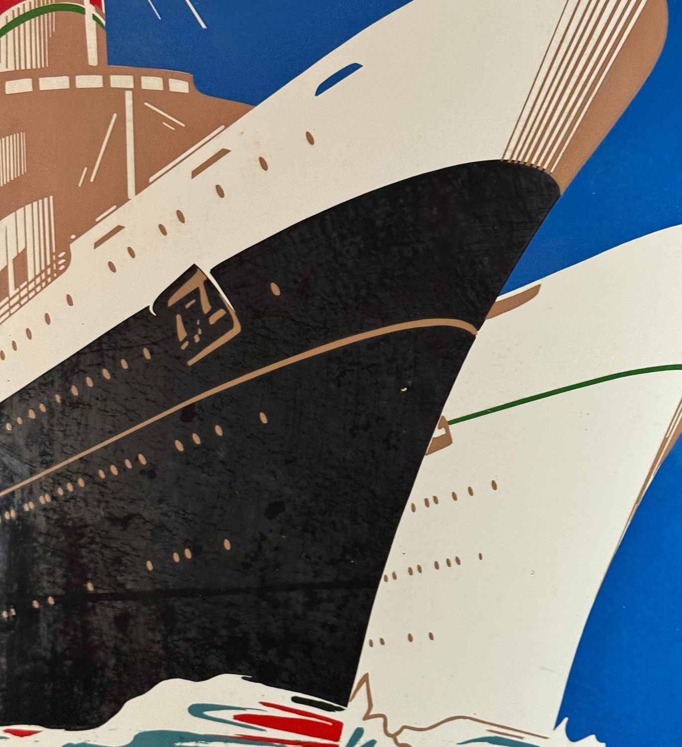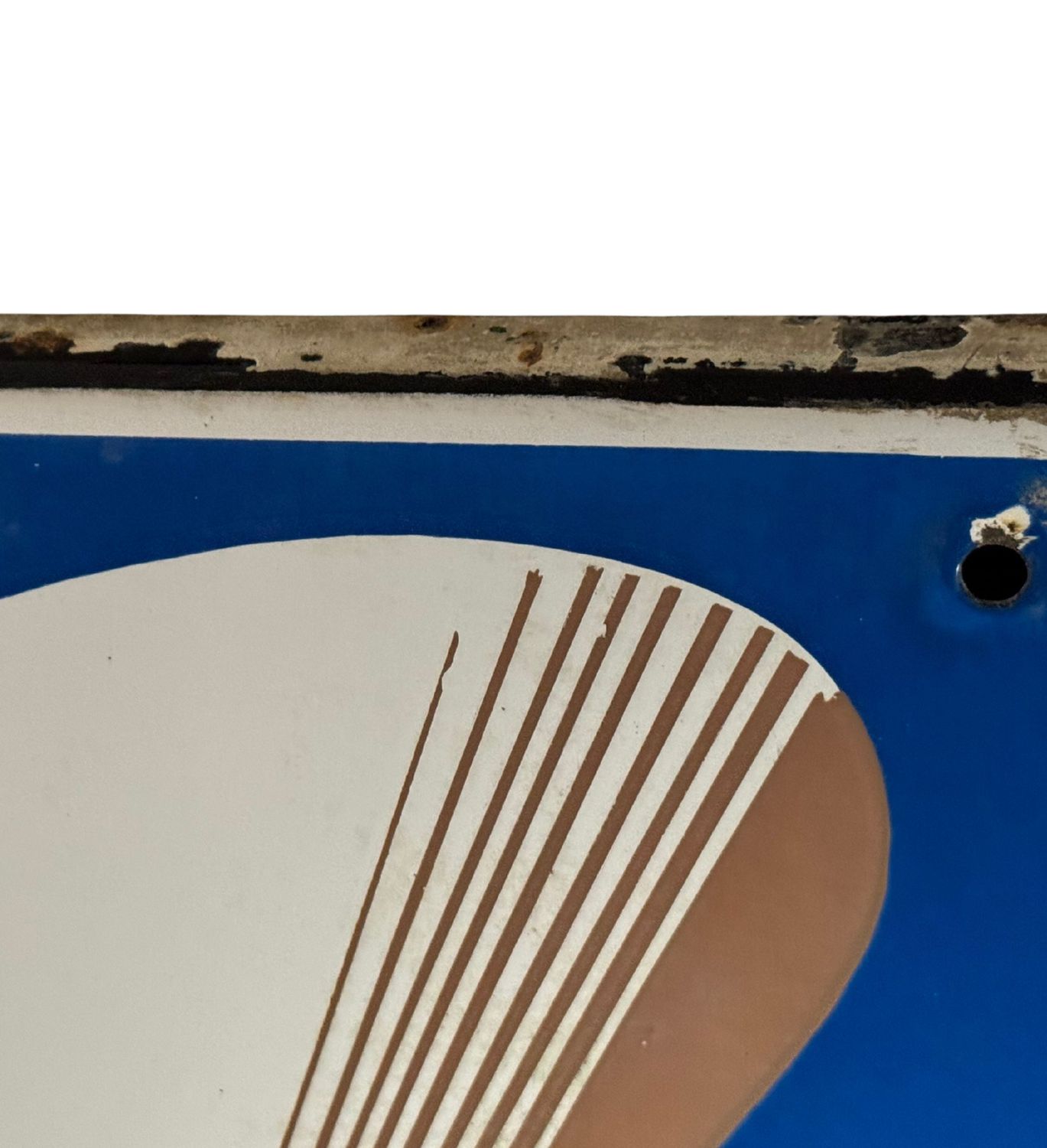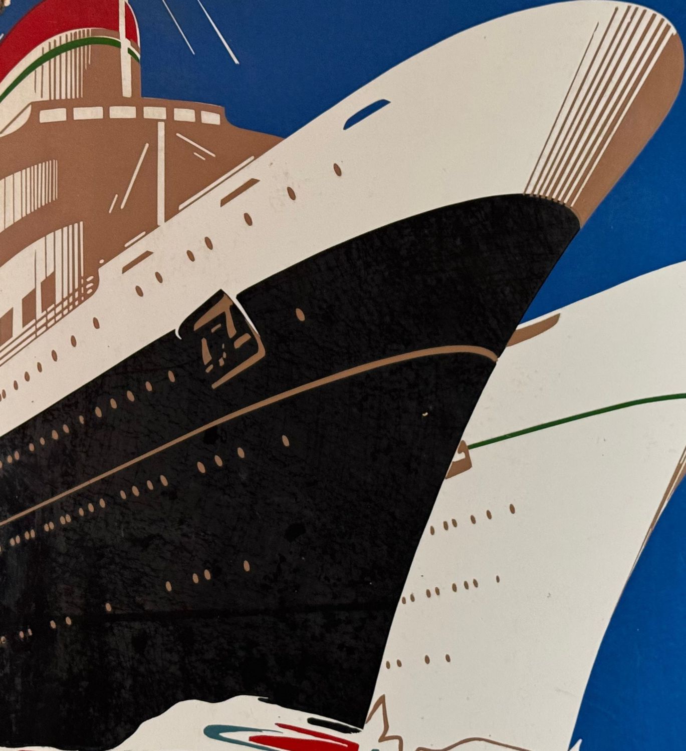 Insegna smaltata originale di (rappresentanza italiana), prodotta dalla Smalteria Perego di Trezzo tra il 1930 e il 1950. Dimensioni: 70 × 50 cm. L’insegna presenta una grafica di gusto futurista raffigurante due navi in navigazione, riconducibili all’Andrea Doria e al Cristoforo Colombo. Proveniente da collezione privata, si presenta in buone condizioni generali, con lievi segni di vissuto, come da foto allegate.