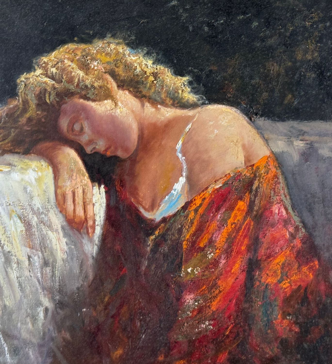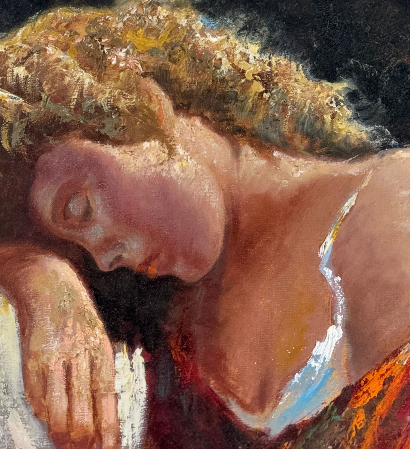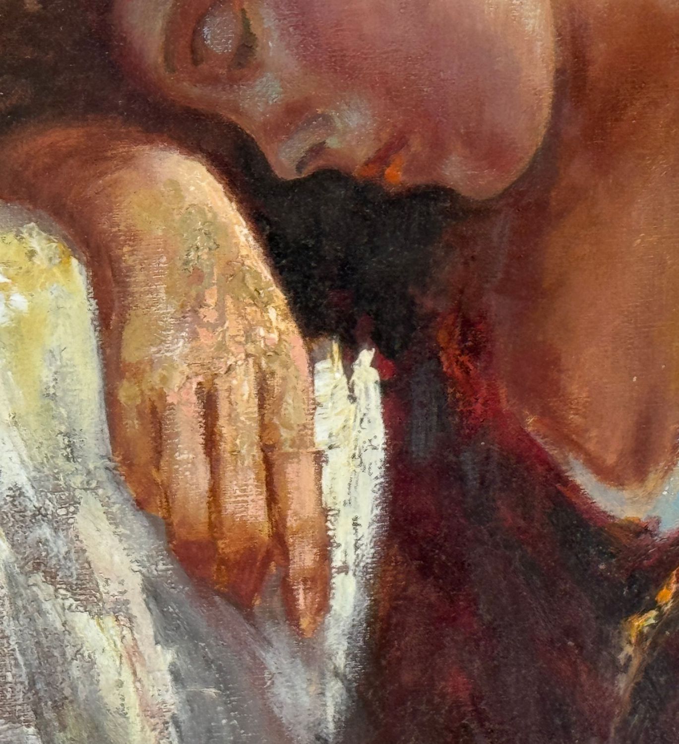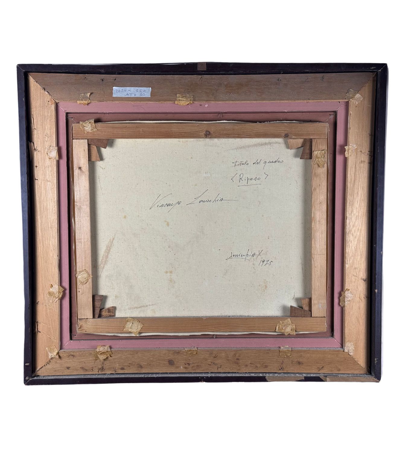 Dipinto olio su tela, periodo XX secolo scuola Italiana, raffigurante "Il Riposo". Dimensioni compreso cornice: 86x76 cm. Dimensioni interno cornice: 60x50 cm. Reca firma in basso a sinistra e autentica sul retro da Vincenzo Laricchia. Opera in buone condizioni.