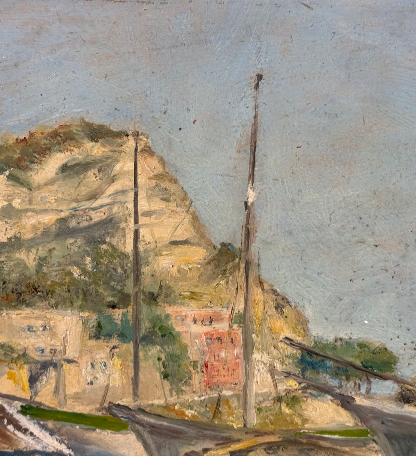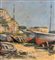 Dipinto olio su cartoncino, periodo XX secolo scuola Italiana, raffigurante Scorcio di marina con barche a secco. Dimensioni: 38x30 cm. Reca firma in basso a destra da artista non identificato. Opera in buone condizioni con lievi segni di vissuto come da foto allegate.
