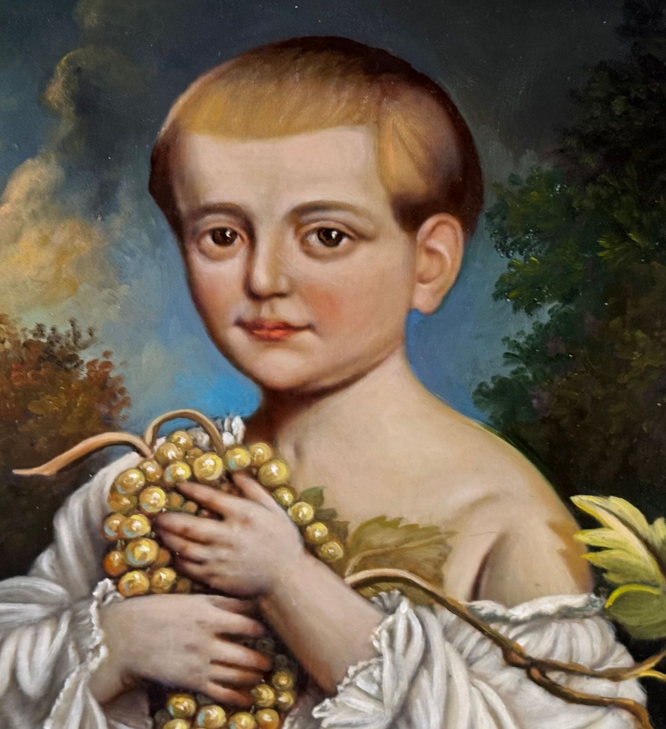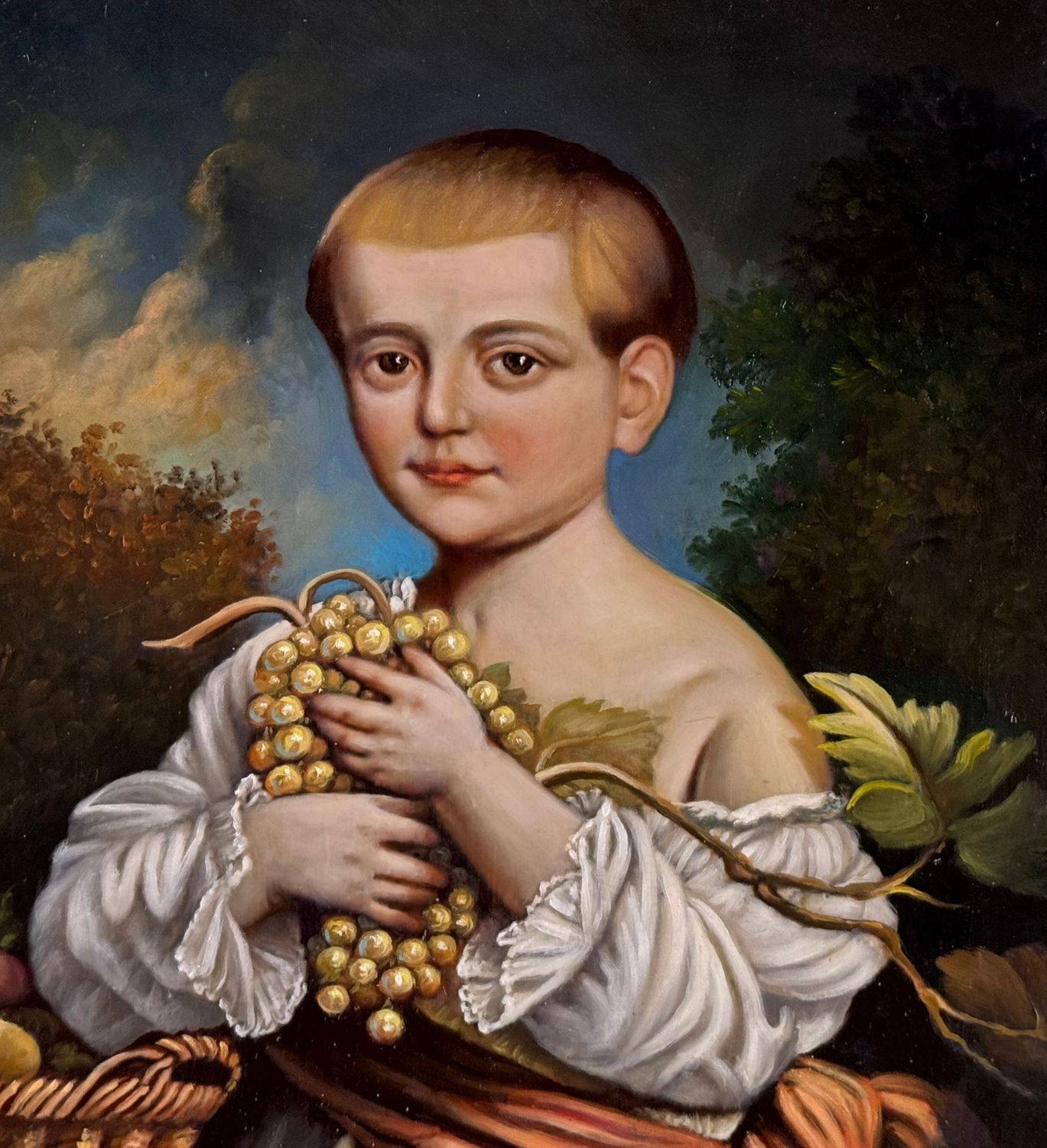 Dipinto olio su cartoncino, periodo prima metà del XX secolo scuola Italiana, raffigurante Ritratto di bambino con frutta. Dimensioni: 40x50 cm. Reca firma in basso a destra artista non identificato. Opera in buone condizioni.