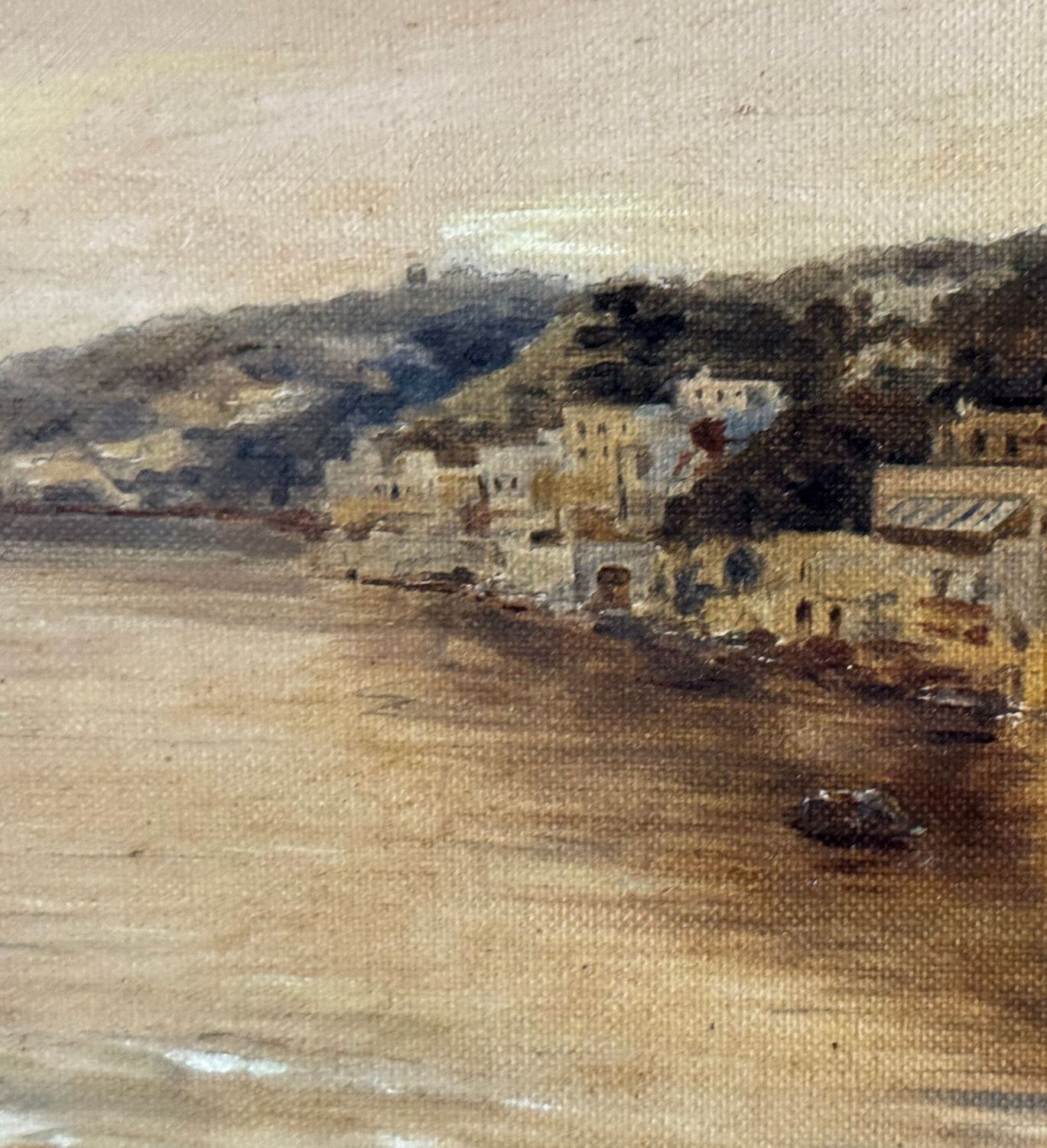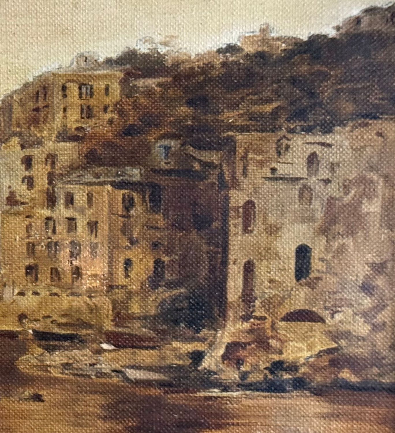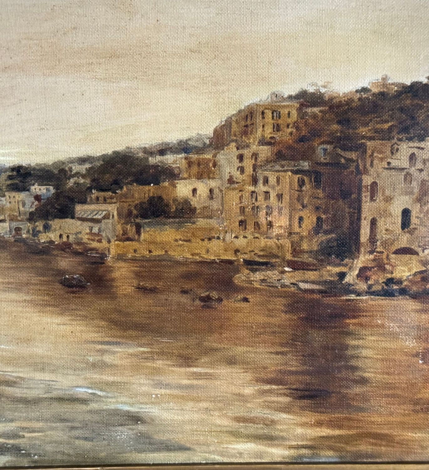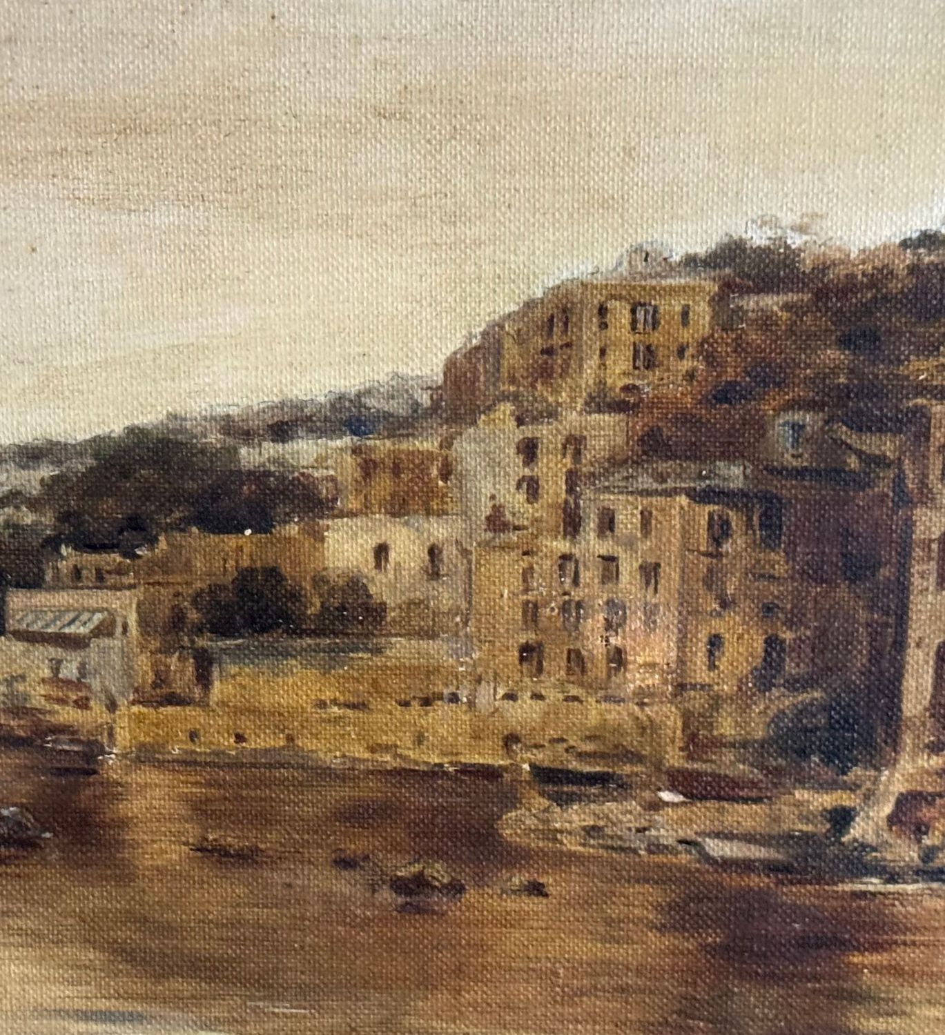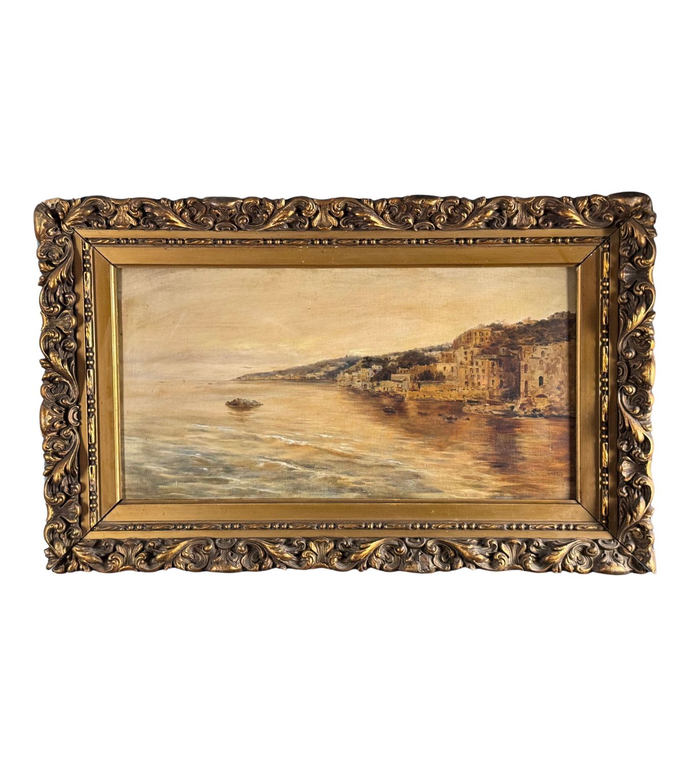 Dipinto olio su tela, periodo XIX/XX secolo scuola Napoletana raffigurante Scorcio di marina napoletana. Dimensioni compreso cornice: 42x70 cm. Dimensioni interno cornice: 28x54 cm. Artista anonimo. Opera in buone condizioni.