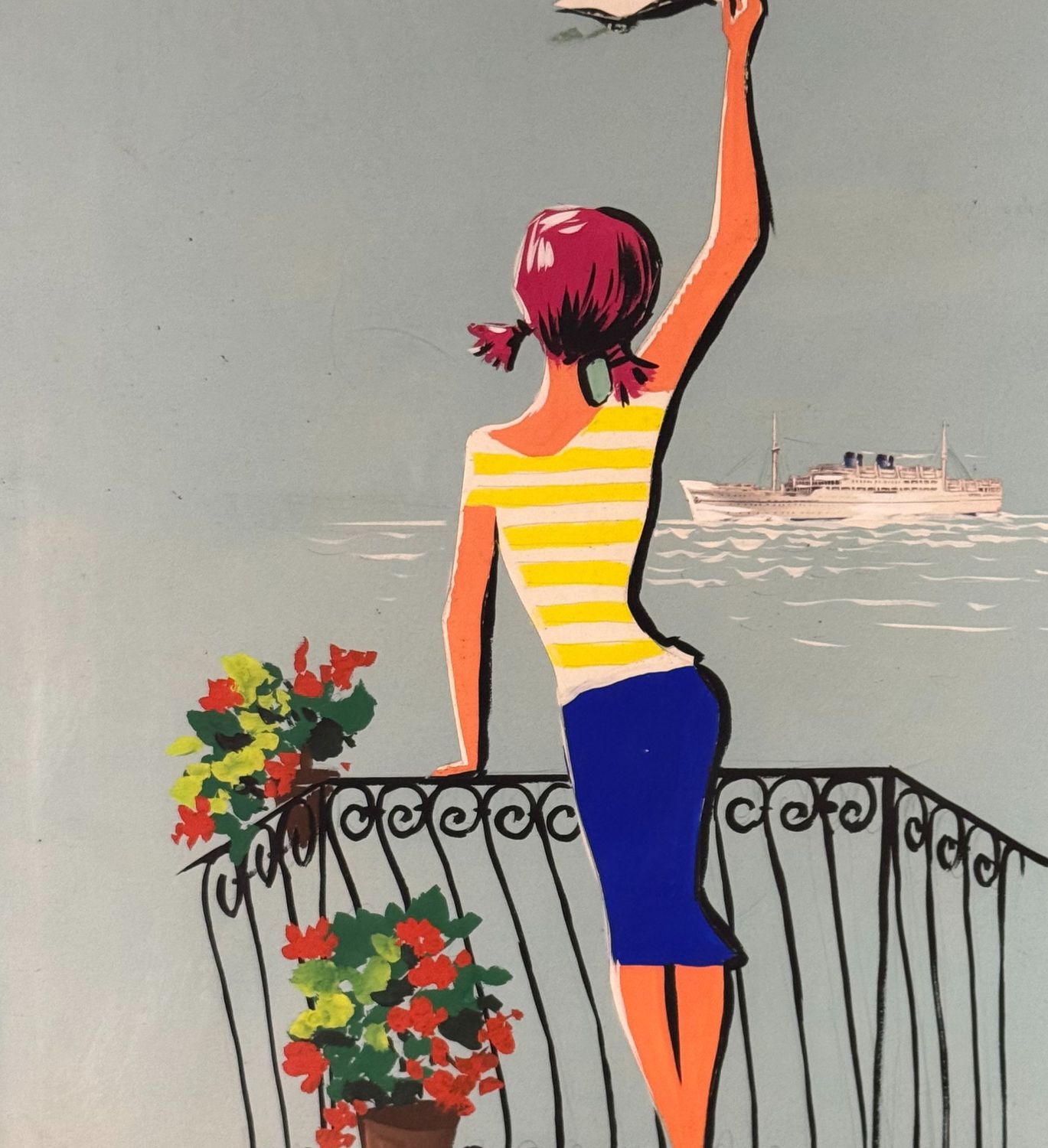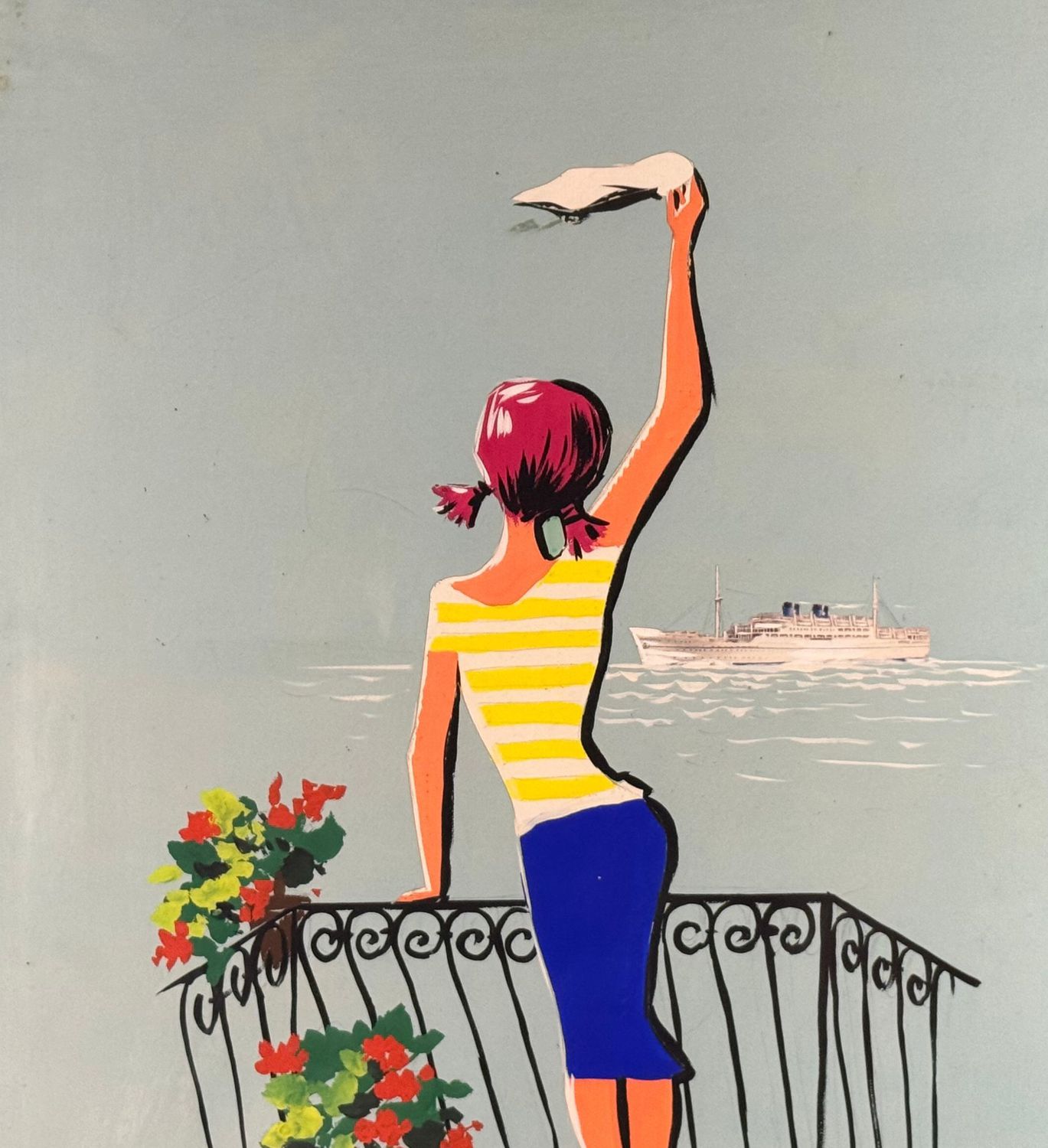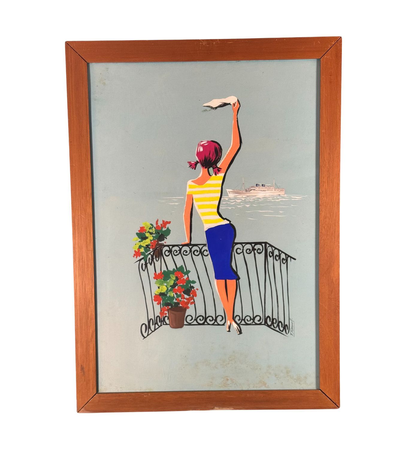 Dipinto acrilico su cartoncino, periodo XX secolo scuola Italiana raffigurante Donna al balcone su marina. Dimensioni compreso cornice: 52x72 cm. Dimensioni interno cornice: 45x65 cm. Firmato laterale a destra Filippo Romolo (bozzetto registrato al numero 8481/57, come da timbro sul retro). Opera in buone condizioni con lievi segni di vissuto come da foto allegate.